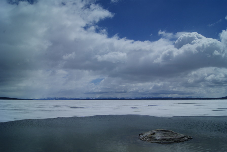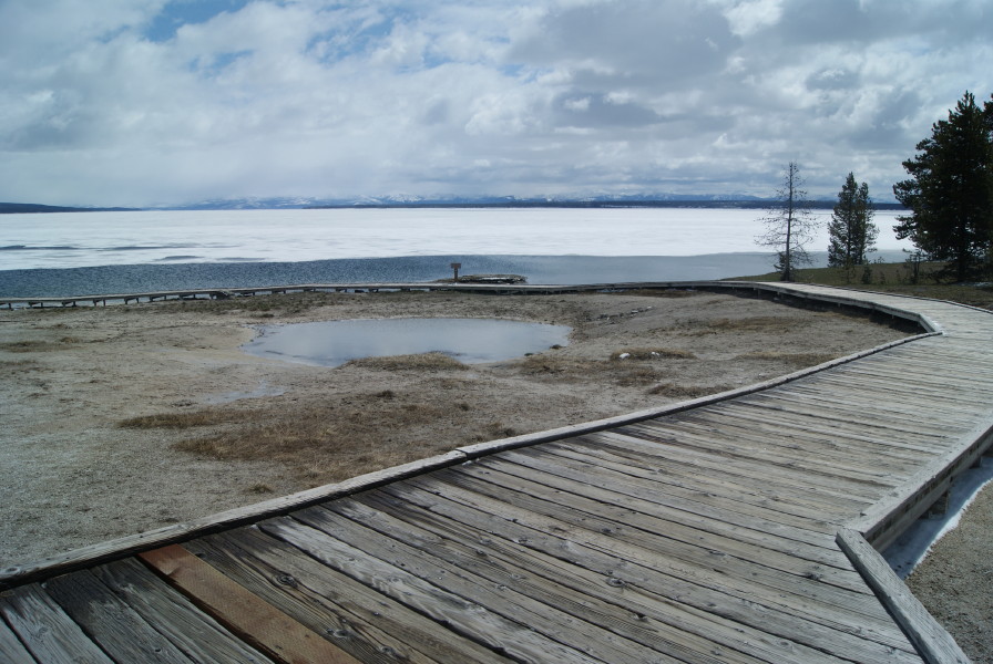 Der Yellowstone Lake ist riesig und fast komplett zugefroren. Hier unten sieht man kaum Tiere.. nicht mal Bisons, die wir gestern nördlich vom Old Faithful Village zuhauf gesehen hatten. Im Lake fischt nur ein Otter einsam nach Fischen.