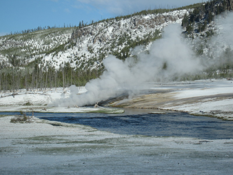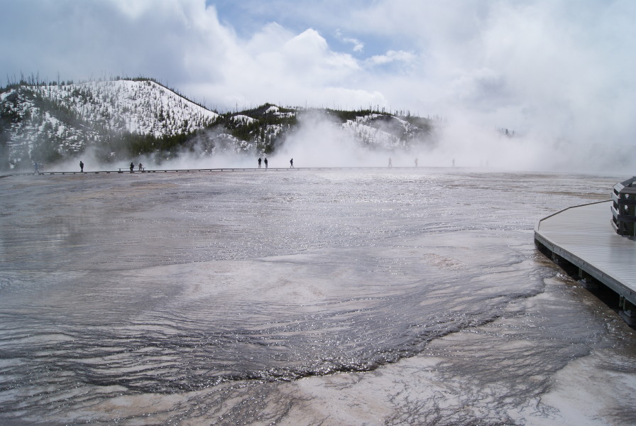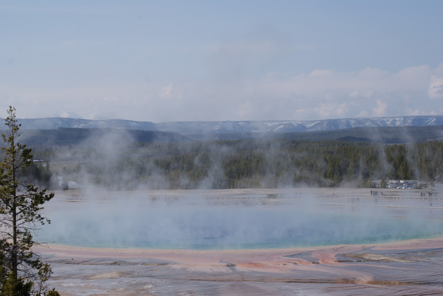 Mittlerweile ist nur noch die Strasse vom Canyon Village zur Tower Junction gesperrt, sowie einige kleine Nebenstrecken. Leider auch die Strasse zum Trail, die einen Überblick zum Grand Prismatic Spring bietet. Am Midway Geysir Basin ist es extrem windig und wegen der eisigen Temperaturen dampfen die Pools dermaßen, daß man kaum ein ordenliches Bild zustande bekommt. Am Grand Prismatic Spring beschlägt mein Objektiv und ich kann nicht mal die orangefarbene "Umrandung" fotografieren :-(