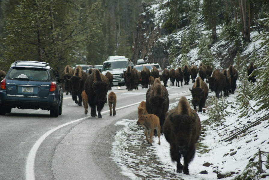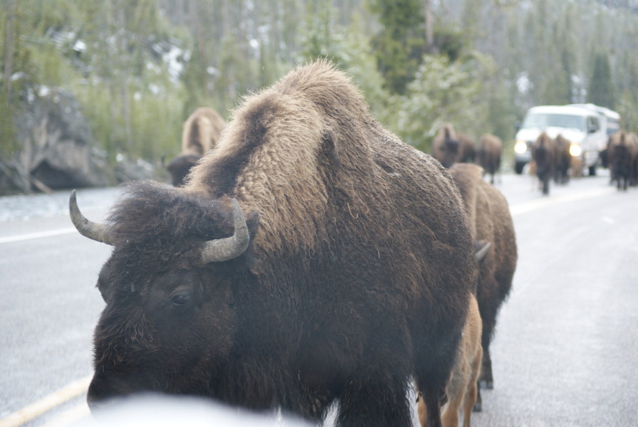Wir fahren weiter und sehen weitere Büffel-Herden. Hier liegt auch längst nicht mehr soviel Schnee. Leider ist nach wenigen Metern die Strasse gesperrt. Oh Menno... dabei wollte ich doch noch ins Lamar Valley, weil dort die Wahrscheinlichkeit Wölfe zu beobachten besonders groß sein soll.