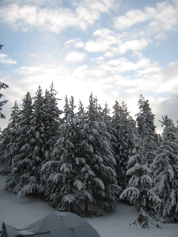 Die Nacht war gar nicht mal sooo kalt, wie gedacht. Aber irgendwann bin ich von einem kühlen, nassen Gefühl am Kopf wach geworden... Bison-Pipi? Nein! Der beständige Schnee-Schauer hat sich auf die Außenwand unseres Zeltes gelegt und es nach innen gedrückt. Abgeschüttelt und weiter gepennt sind eins.. Gegen 5 Uhr krabbeln wir aus dem Zelt. Das konnte sich leider nicht mehr gegen die 15 cm Neuschnee erwehren und ist teilweise im vorderen Bereich eingebrochen... der Boden ist knüppeldick gefroren und ich muss aufpassen, daß ich mir auf dem Weg zum Klo-Häuschen nicht den Oberschenkel-Hals breche. Kurzfristig überlege ich, dort auf dem Boden noch ein bißchen zu schlafen, denn es ist beheizt ;-)