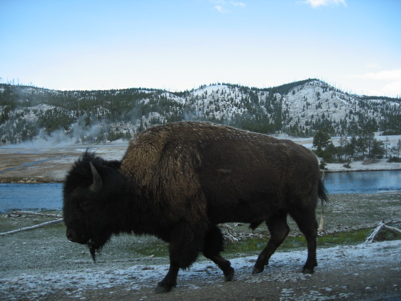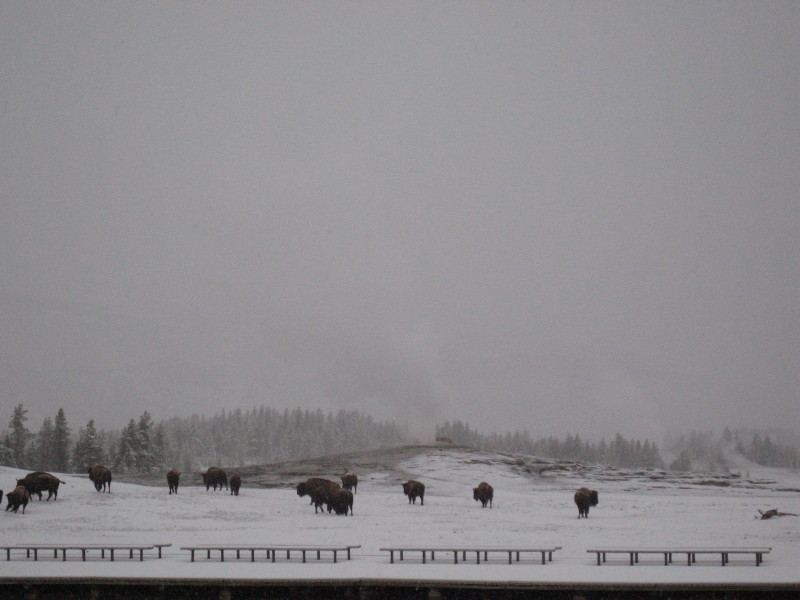 In der Cafeteria der Old Faithful Lodge essen wir in Kantinenatmosphäre mit Blick auf den Old Faithful, als plötzlich eine Büffel-Herde vorbeizieht. Leider hab ich nur die kleine Knipse mit und damit lässt sich der Kampf der Bullen nicht gut festhalten. Die Angestellten erzählen uns, daß es nur sehr selten vorkommt, daß die Büffel überhaupt bis hier hoch kommen.