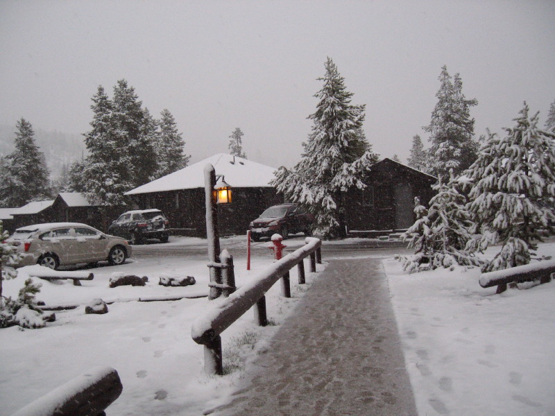 In der Old Faithful Lodge fragen wir mit wenig Hoffnung nach irgendeiner freien Unterkunft. Und siehe da, wir können noch eine Budget Cabin bekommen. Für 67$ die Nacht mieten wir uns gleich für 2 Nächte ein. Mit der Lady am Desk wieder das typische Frage-Antwort-Spiel... "woher kommt ihr?.. wo genau in Deutschland?.." Und dann erzählt sie witzigerweise, daß ihre Tochter in unserer Landeshauptstadt zum Schüleraustausch war. Sie schreibt dann auch gleich bei unserem Wohnort "Saarbrücken" hin :-)