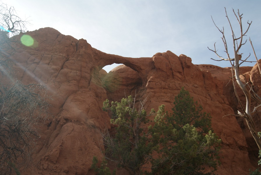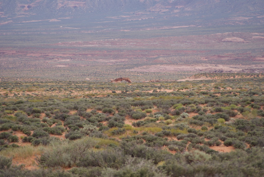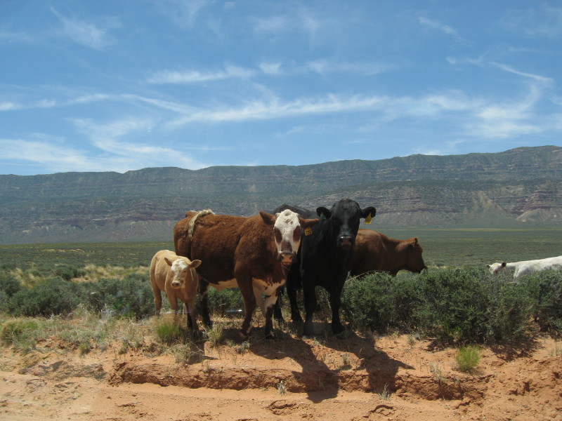 Ich hab noch den Weg zum Broken Bow Arch und Sunset Arch ausgedruckt.. Patrick ist aber leicht angenervt vom steinigen Weg und ist nicht zum Wandern zu bewegen. Den Sunset Arch kann ich ihm aber aufschwatzen "nur 3 Meilen Schatzi... gar nicht weit... ganz ebener Weg". Am Parkplatz angekommen ist es bereits 16:30 Uhr und wir können auch weit und breit keinen Arch sehen.. angeblich wäre das von der Strasse aus kein Problem. Hm.. nachdem wir ein Stück gelaufen sind, können wir den Bogen dann doch in der Ferne erkennen. Der Hase meint sofort, daß das GANZ SICHER mehr als 3 Meilen sind und weigert sich standhaft hinzulaufen. Blöderweise steht auch eine ganze Kuhherde auf dem Gebiet. Die gucken schon so "ihr kummt hier ned rrrein"