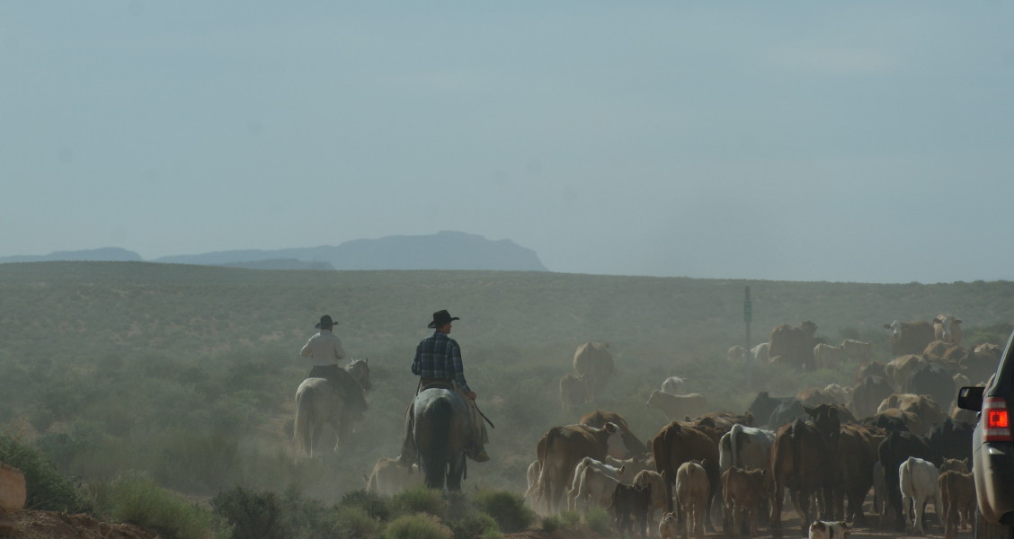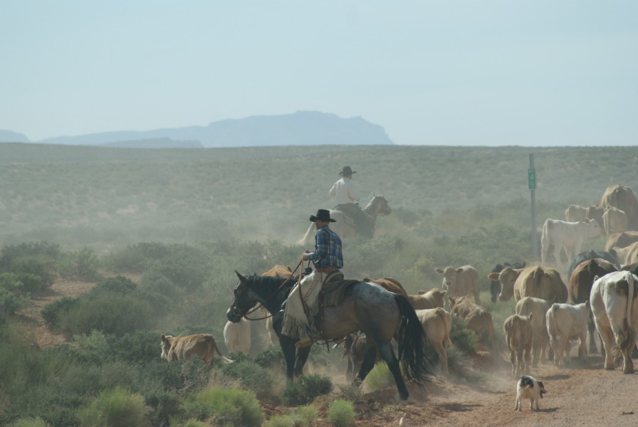 Es soll sich noch rausstellen, daß wir gut daran tun, uns zeitig vom Acker zu machen. So erleben wir nämlich eine Szene, wie aus Bonanza.. 5 - 6 Cowboys, die eine recht große Herde Rinder an der Strasse lang treiben... wie im Film.. beeindruckend! Die kleinen Hunde fungieren dabei als "Hüte-Hunde" und treiben die frechen Kälber wieder zur Herde zurück.