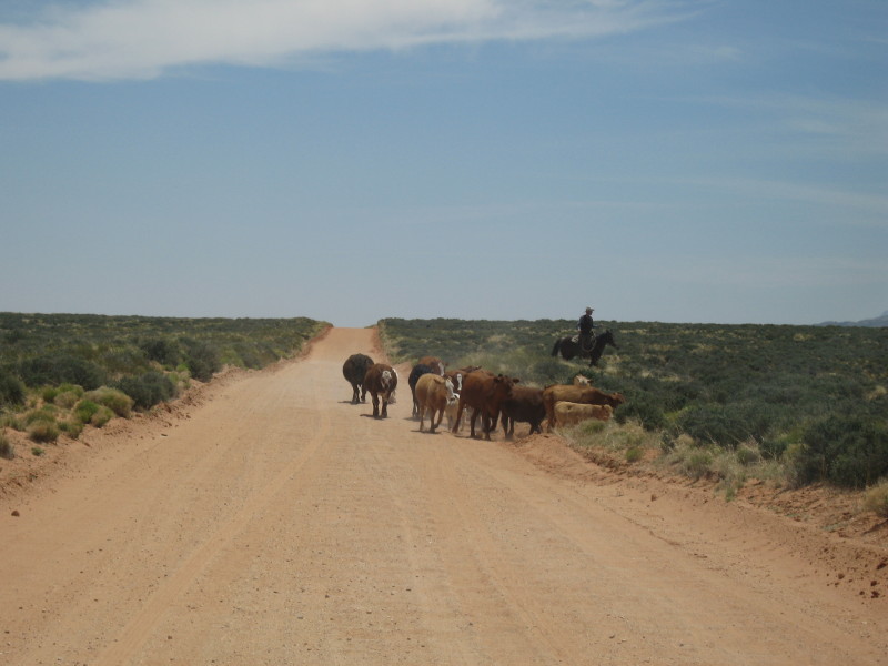 Ich mache jede Menge Fotos, als sich von hinten ein roter Wagen nach vorne drängelt und bei den Jungs nachfragt, ob man an den Muh-Kuh's vorbeifahren könnte. Der Ober-Reiter meint, die Autos müssten ganz dicht hintereinander herfahren... quasi Gas geben und durch. Wir fahren als drittes Auto und als wir sehen, welchen Stress, die armen Rindviecher durch die Blechkisten haben, lassen wir uns zurückfallen und zockeln wieder hinter der Herde her.
