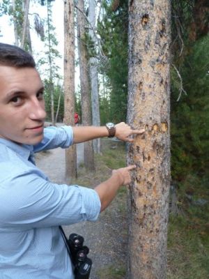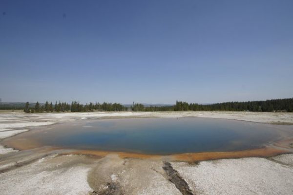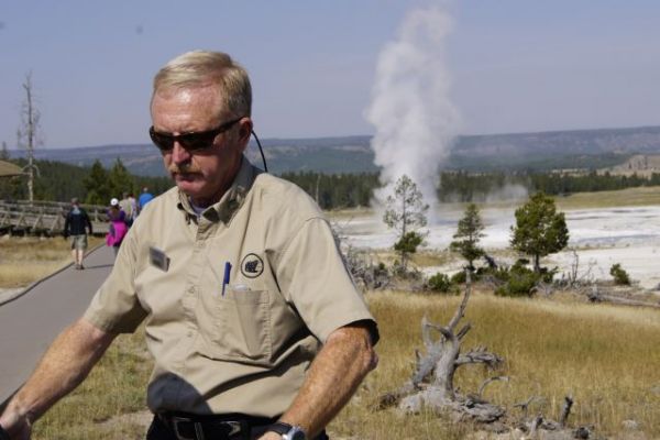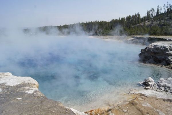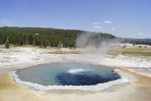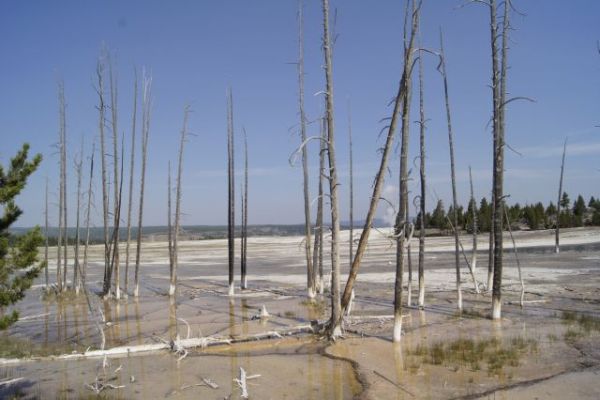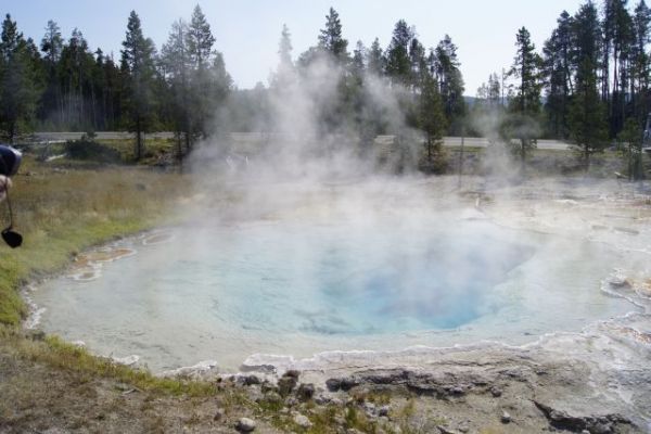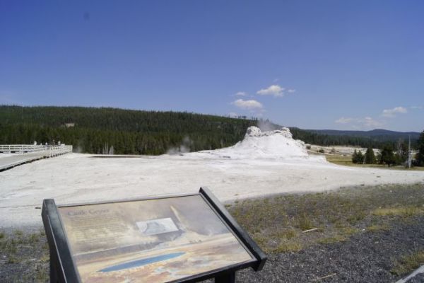 Weiter geht es zum Roosevelt Tower. Bei den Kindern machen sich aufgrund der vielen Stopps schon gewisse Ermüdungserscheinungen breit. Aber die Älteren kennen kein Erbarmen. Nach etlichen Runden auf dem beengten Parkplatz am Roosevelt Tower hat auch der Van sein Plätzchen gefunden, und wir machen uns auf den Weg zum Steamboat Geysir, vorbei am wunderschön blau schimmernden und grässlich stinkenden Emerald Pool. Danach haben Lisa, Jonas, Julian und Jasmin die Nase voll. Sie beobachten noch eine Weile die Streifenhörnchen in den Holzbalken des Museumsgebäudes und warten dann auf die Rückkehr der anderen drei.