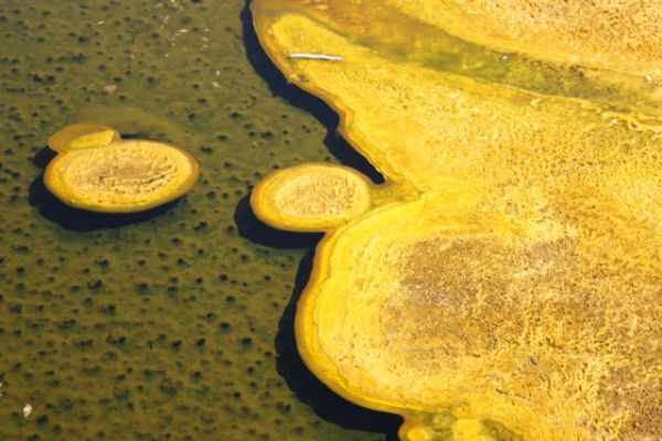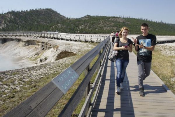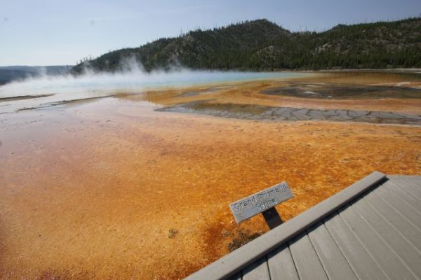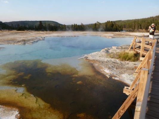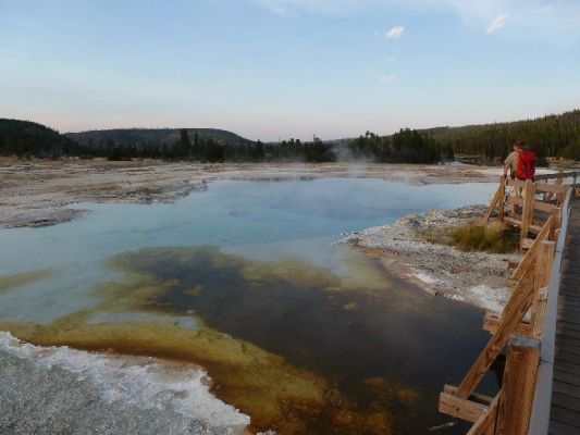 Jakob, Irene und Dieter gehen durch das Museum und finden sich auf der anderen Seite des Gebäudes in einer phantastischen Wunderwelt wieder. Zu ihren Füßen erstreckt sich ein riesiges Dampf- und Poolgelände, das in allen Farben schimmert, begrenzt von zackigen Bergen am Horizont. Nur ein Holzsteg durchzieht diese Wunderlandschaft, von außen kann man schauen und staunen. Einer der schönsten Plätze, den wir in Yellowstone gesehen haben.