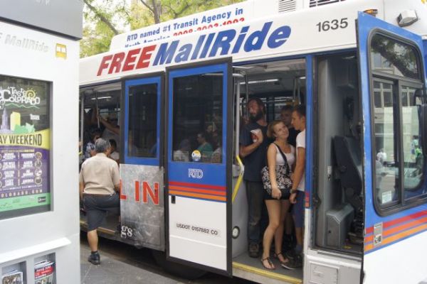 Der Free Shuttle Bus auf der 16th. Es geht meist eng zu, aber Jasmin und Julian passen noch rein.