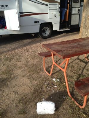 Dann geht die Pack-Arie weiter. Den Joke des Tages leistet sich Jonas. Wir haben noch einen nahezu vollen Sack Eis im Tiefkühlfach liegen. Der festgefrorene Block – das nächste Mal kaufen wir uns einen Eis-Pick; zum Portionieren mit Faust oder Messer auf das Eis einzuhämmern, war nicht so angenehm – wird auf den Rasen der Campsite gekippt, die Plastikverpackung entsorgt. Jonas fotografiert den Block mit dem i-Phone und postet dazu auf Facebook: „Soeben großer Eisblock direkt neben dem Womo auf die Erde gefallen, stammt vermutlich aus einem Flugzeug. Zum Glück wurde niemand verletzt.“ Die Reaktionen darauf amüsieren uns noch tagelang. Es wurde zu einer saftigen Schadenersatzklage geraten, andere wollten wissen, ob der Eisblock nach Pipi riecht.