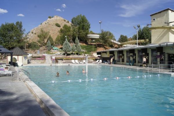 Dafür baden wir im großen Becken, das fast Badewannentemperatur hat. Hier werden die heißen Quellen mit kühlem Wasser gemischt. Es gibt mehrere Rutschen, leider macht die große um 17 Uhr dicht. Alles in allem: keine Empfehlung für die Badeanstalt. Das zweite kommerzielle Bad sehen wir uns von außen an – auch nicht besser und mit 17 Dollar Eintritt sogar noch teurer.