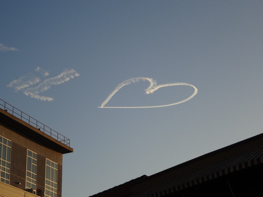 Der Valentinstag war auch in der Luft zu sehen. Den ganzen Tag bis zum Sonnenuntergang wurden Namen und Herzen von einem Flugzeug in den blauen Himmel gezeichnet.