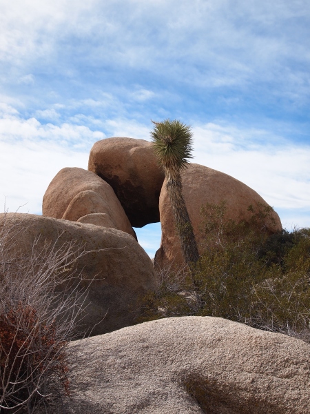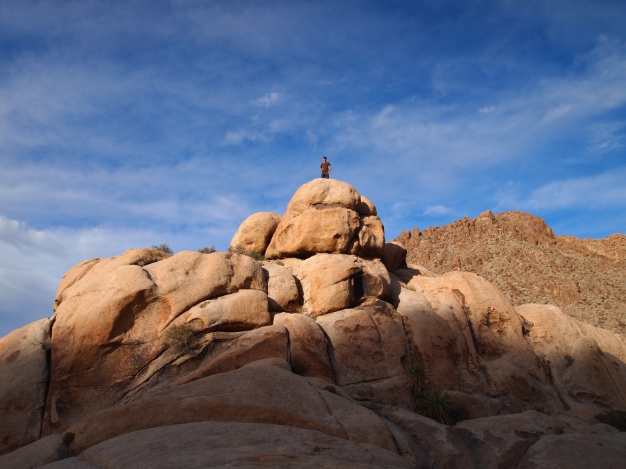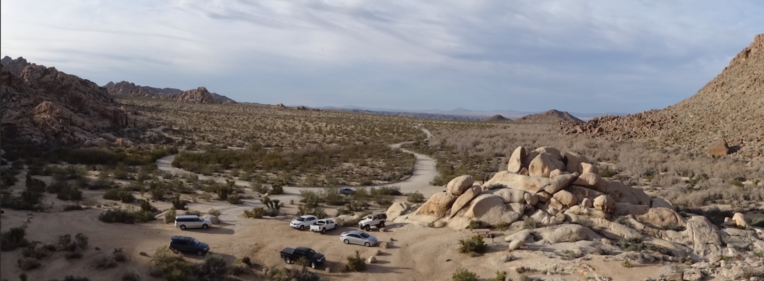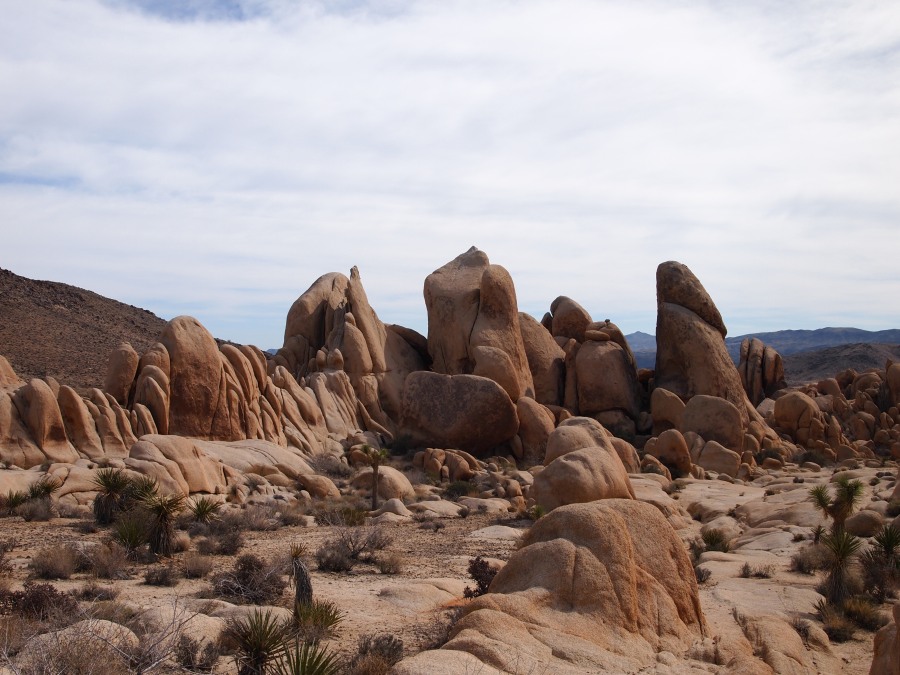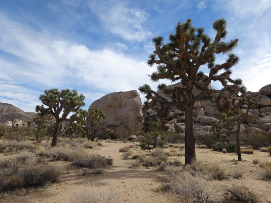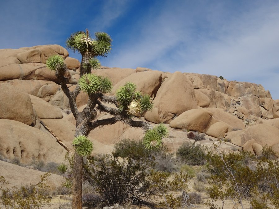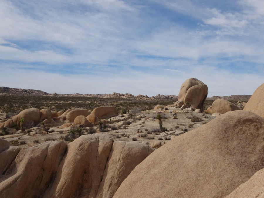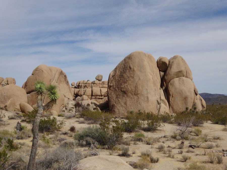 Der Parkeintritt an diesem Wochenende war frei. Im Park ließen wir uns bei unserer Suche nach Geocaches von einem Punkt zum nächsten leiten. Meist führen sie zu besonderen Plätzen. In den amerikanischen Nationalparks gibt es keine physischen Caches, sondern nur virtuelle oder Earthcaches. Diese sind an Punkten von besonderem geologischen Interesse gelegt und sollen den Besucher mit der Besonderheit des Ortes bekannt machen. Als erstes fuhren wir zu einem Platz etwas nördlich des Skull-Tafoni. Wir spazierten zu einer Felsansammlung. Vereinzelt stehen Joshua Trees umher.