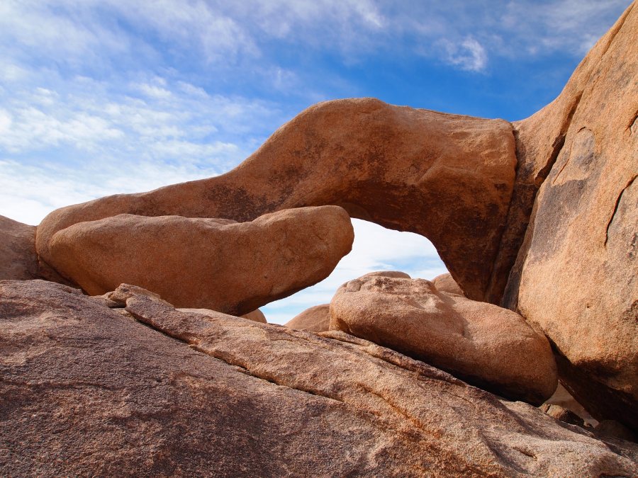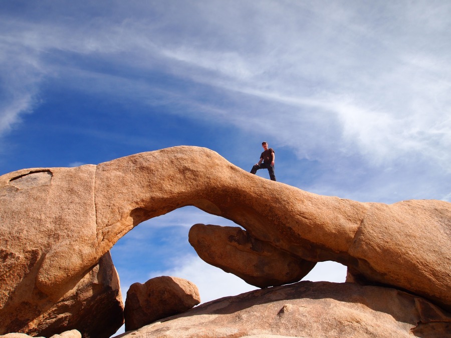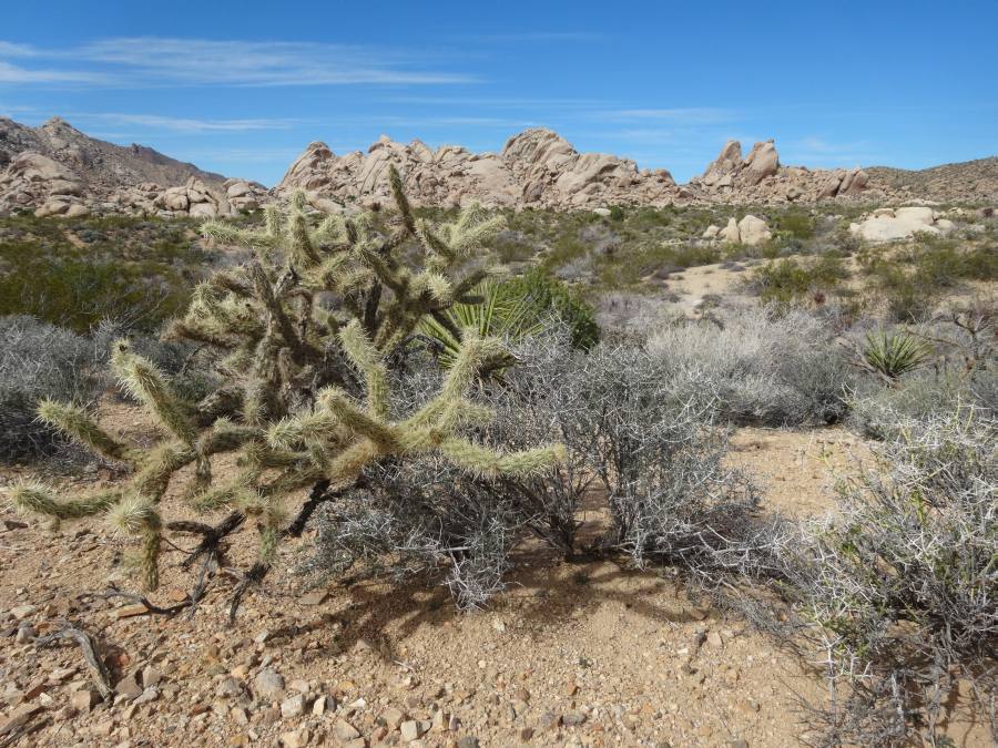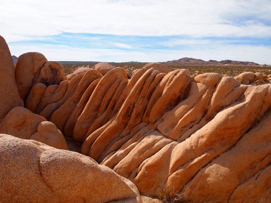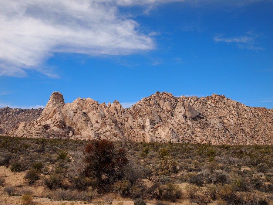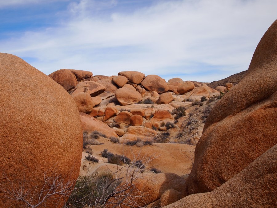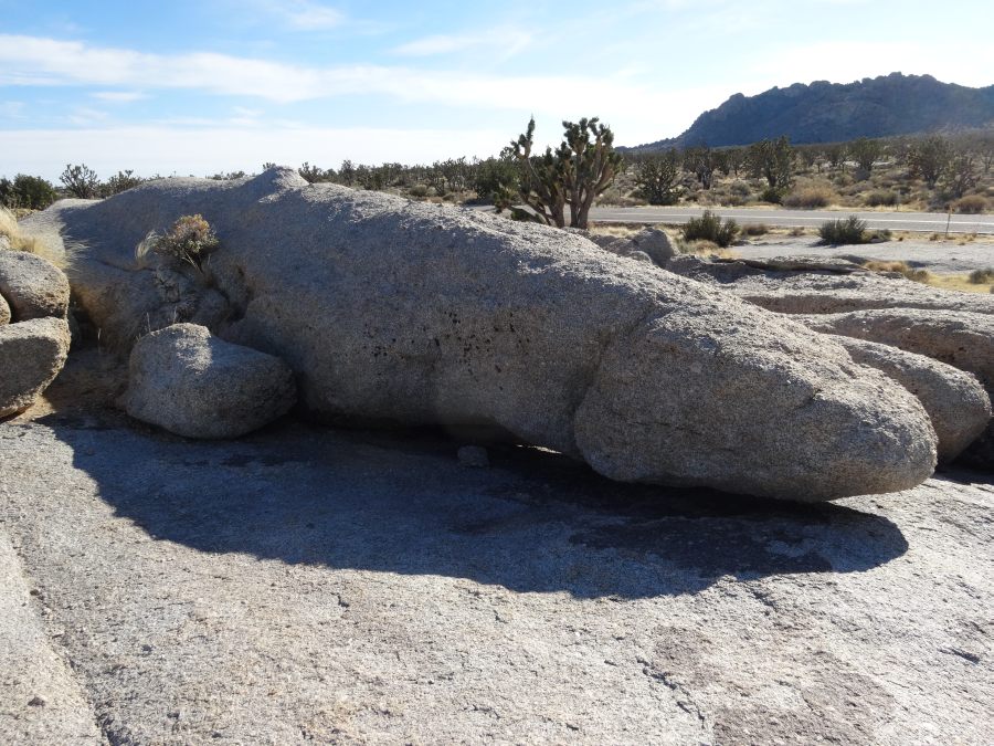 Der Parkeintritt an diesem Wochenende war frei. Im Park ließen wir uns bei unserer Suche nach Geocaches von einem Punkt zum nächsten leiten. Meist führen sie zu besonderen Plätzen. In den amerikanischen Nationalparks gibt es keine physischen Caches, sondern nur virtuelle oder Earthcaches. Diese sind an Punkten von besonderem geologischen Interesse gelegt und sollen den Besucher mit der Besonderheit des Ortes bekannt machen. Als erstes fuhren wir zu einem Platz etwas nördlich des Skull-Tafoni. Wir spazierten zu einer Felsansammlung. Vereinzelt stehen Joshua Trees umher.