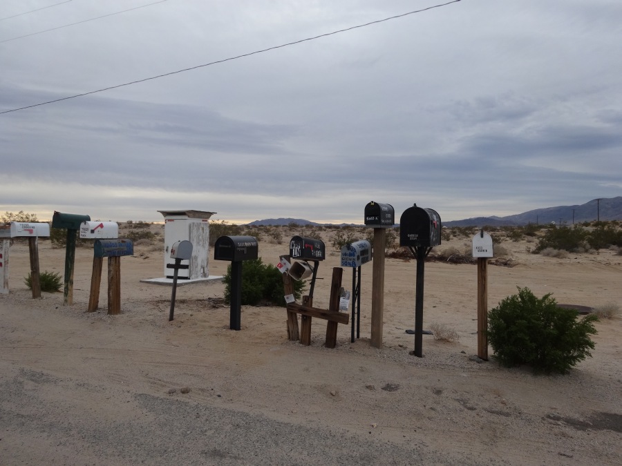 In diesem Motel war es angenehm ruhig und wir konnten endlich ordentlich schlafen. Wir waren aber trotzdem früh auf und verließen das Motel kurz nach Sonnenaufgang. Heute stand nichts Besonderes auf dem Programm, wir begannen daher einen Teil eines Power Trails an der Straße von 29 Palms Richtung Amboy. Es gab viel Zeit die Gegend genauer zu studieren. Zahlreiche Postkästen, aber keine Häuser.
