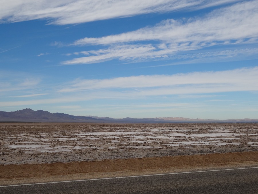 Nach zweieinhalb Stunden hatten wir genug Büsche und Dosen gesehen und fuhren zum Amboy Krater. Die Straße führte durch ausgetrocknete Seen und deren Resten vorbei.