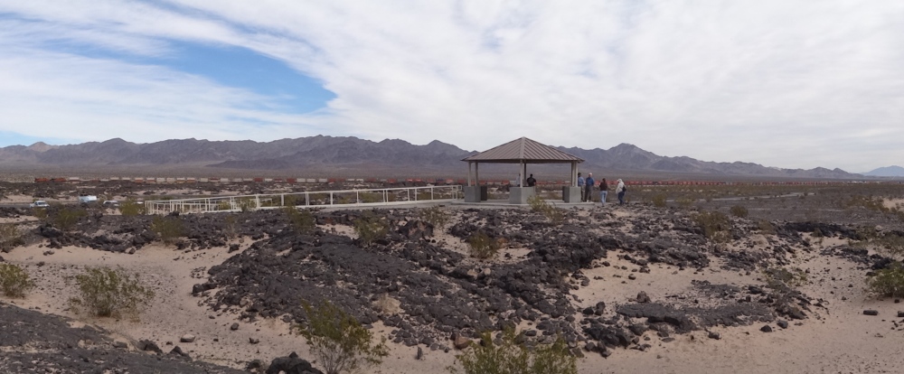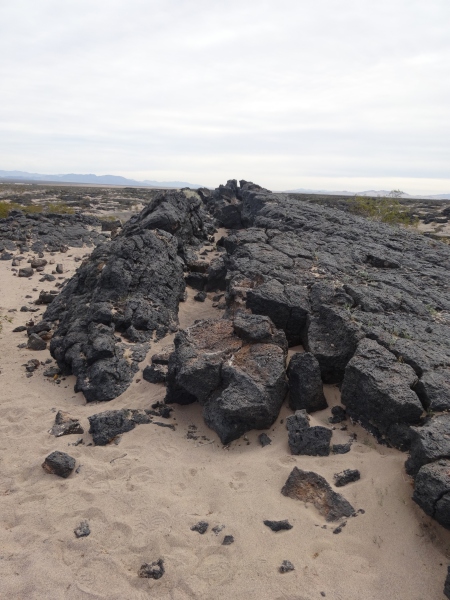 Der Amboy Crater erhebt sich wie ein überdimensionaler schwarzer Pickel aus der Ebene.