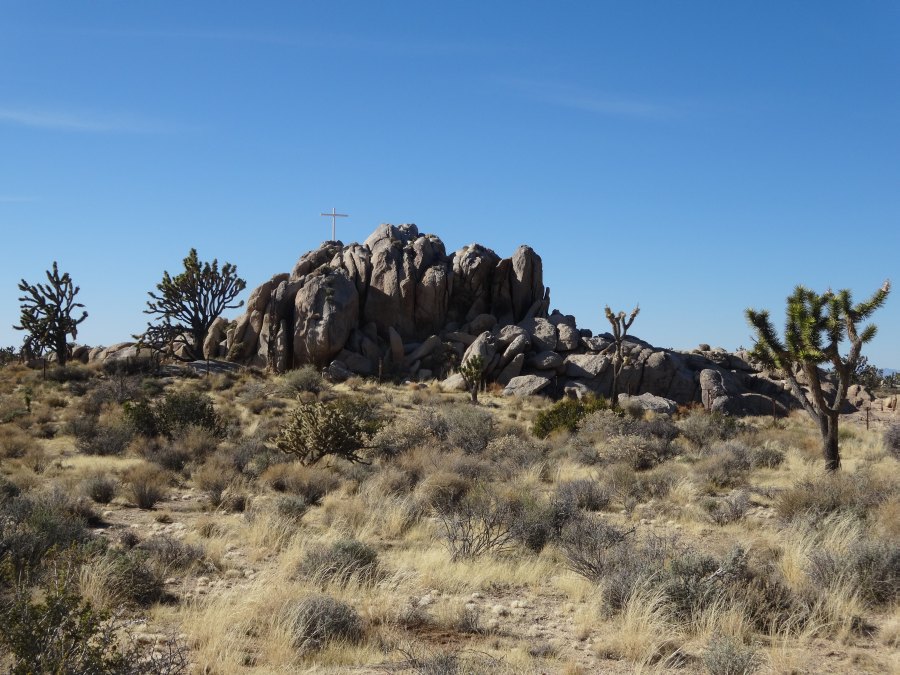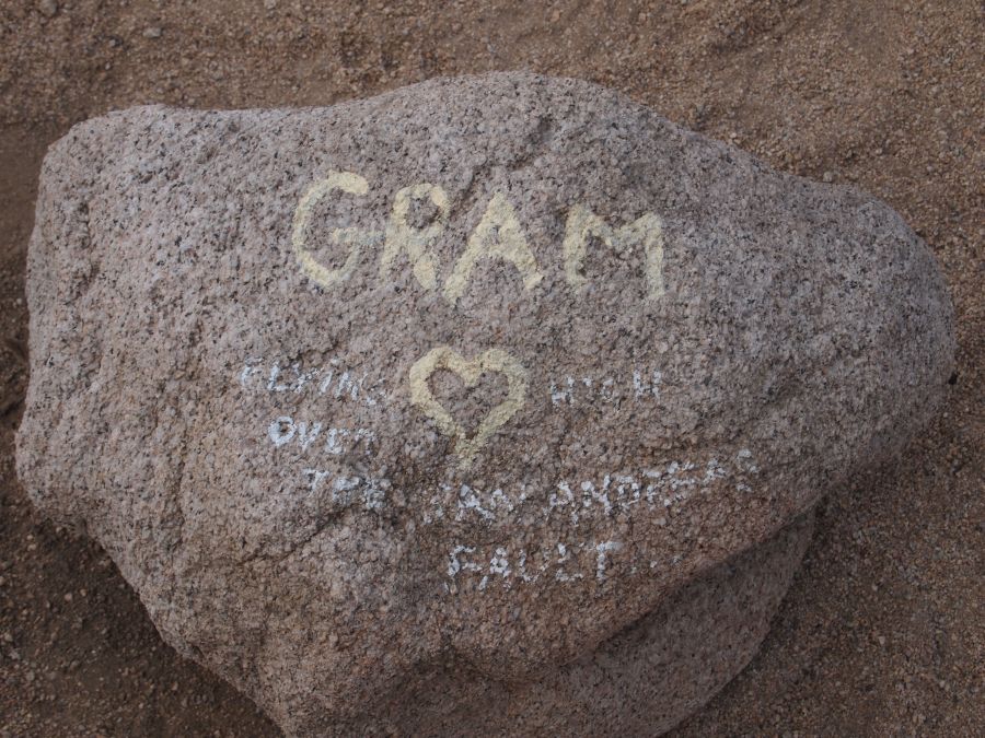 An diesem Platz bei der Kreuzung liegt ein recht unscheinbarer Gedenkstein für einen Rock Country Musiker namens Gram Parsons. Nach seinem Tod im Joshua Tree Inn, soll ein Freund ihn im Park zu verbrennen versucht haben. Ob das genau hier war kann ich aber nicht sagen.