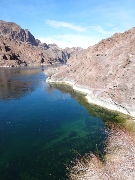 Wir waren wieder früh auf und besorgten noch Lebensmittel. Unser Ziel war der White Canyon Trail zum Colorado und zurück über den Hot Spring Trail. Der Weg beginnt auf der Arizonaseite des Colorados. In Boulder übersah ich bei der Kreuzung, das wir links abbiegen hätten sollen. So fuhren wir durch Boulder. War nicht uninteressant, ein schönes Städtchen mit herausgeputzten Häusern. Bevor man wieder zum Highway kommt, gibt es noch einen schönen Ausblick auf den Lake Mead. Zu sehen ist auch, dass hier nicht gerade die Ärmsten wohnen.