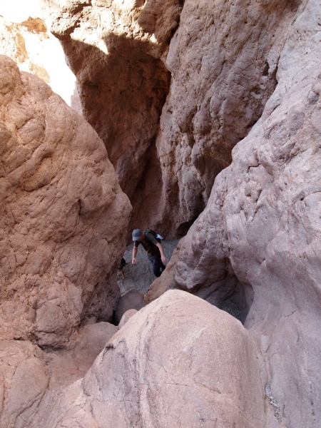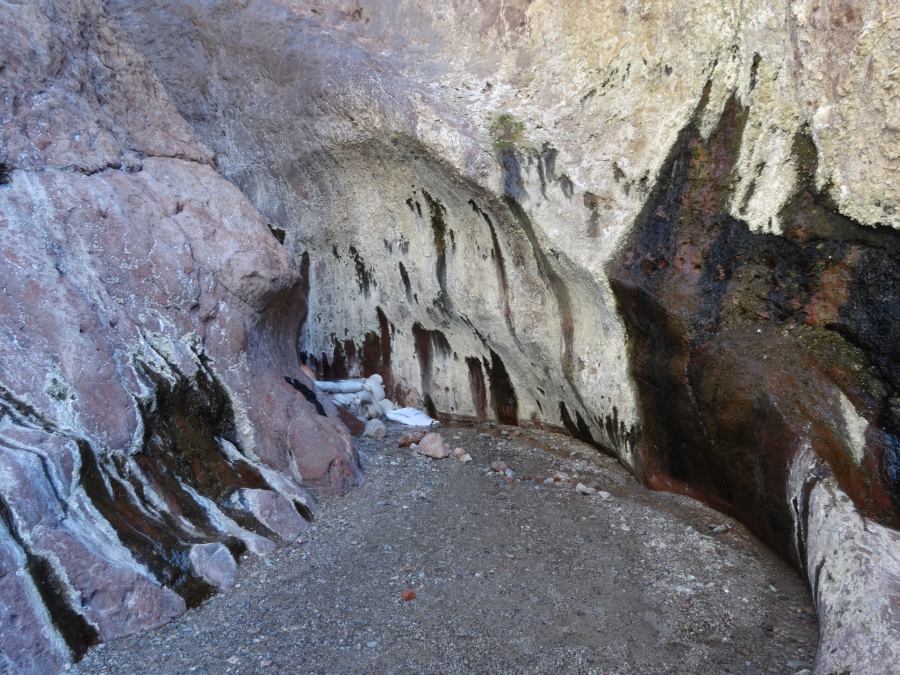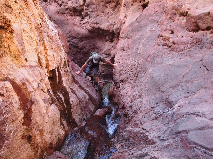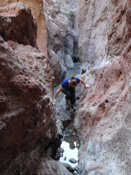 Hier blieben wir nicht lange. Im Quellgebiet des Wassers zogen wir uns wieder an bzw. wechselten die nassen Kleidungsstücke. Das heiße Wasser drückte es aus dem sandigen Boden und den Wänden. Weiter ging es durch den Canyon, diesmal mit wesentlich mehr Kletterei.