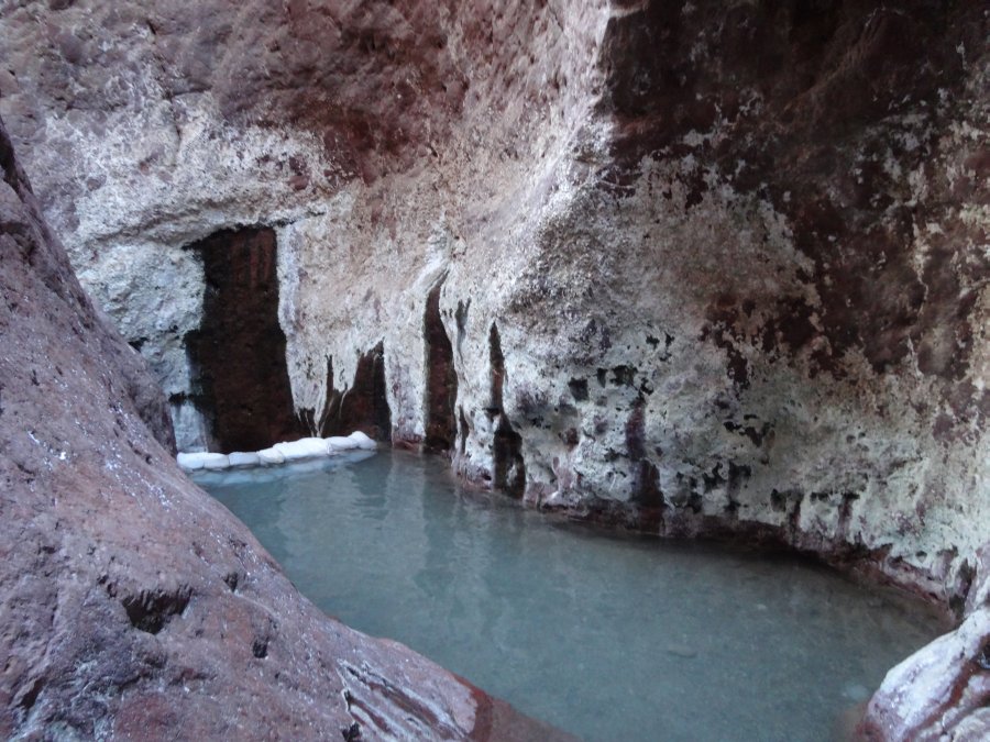 Oben hörten wir bereits Leute sprechen. Sie saßen in einem mit Sandsäcken aufgestauten Pool. Das Wasser im Pool hatte mindestens 35°C und war sehr mineralhaltig.