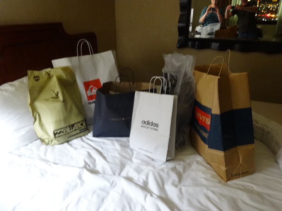 Am Abend statteten wir noch dem südlichen Premium Outlet einen Besuch ab. Da ich meinen Pass und auch den Führerschein in der anderen Hose vergessen hatte, hätten wir fast nicht mit der Kreditkarte bezahlen können. Da Heike ihre Bankomatkarte mit hatte, reichte zur Identifizierung der gleiche Familienname auf den Karten. Unsere Beute: