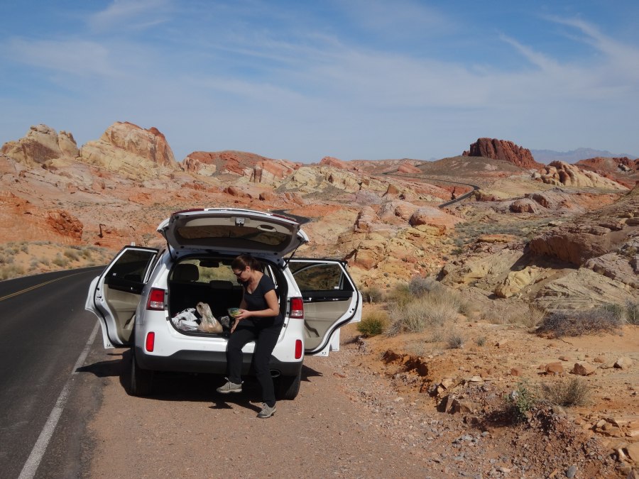Sollte wieder der Valley of Fire Virus zuschlagen? Die ersten beiden Versuche 2006 und 2008 scheiterten aus Zeitgründen, wegen unglücklicher Umstände. Der dritte Versuch 2010 am Wetter, Flash Floods versperrten den Weg. Nach rund einer viertel Stunde kam ein Pickup mit kanadischem Kennzeichen. Gemeinsam mit dem Fahrer versuchten wir einige Dinge. Die Lösung für unser Problem war ein mehrmaliges festes Treten auf das Bremspedal und gleichzeitiges Zurückziehen des Schalthebels. Mit einem Ruck war der Hebel frei. Wir bedankten uns mehrmals und setzten die Fahrt fort.