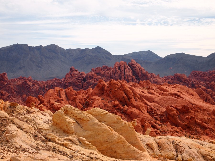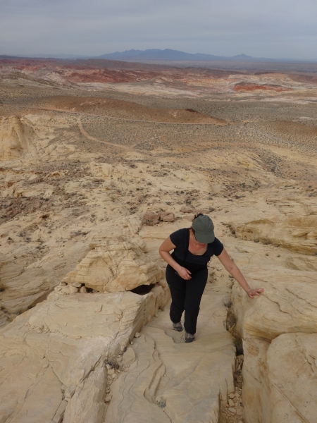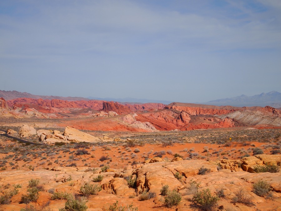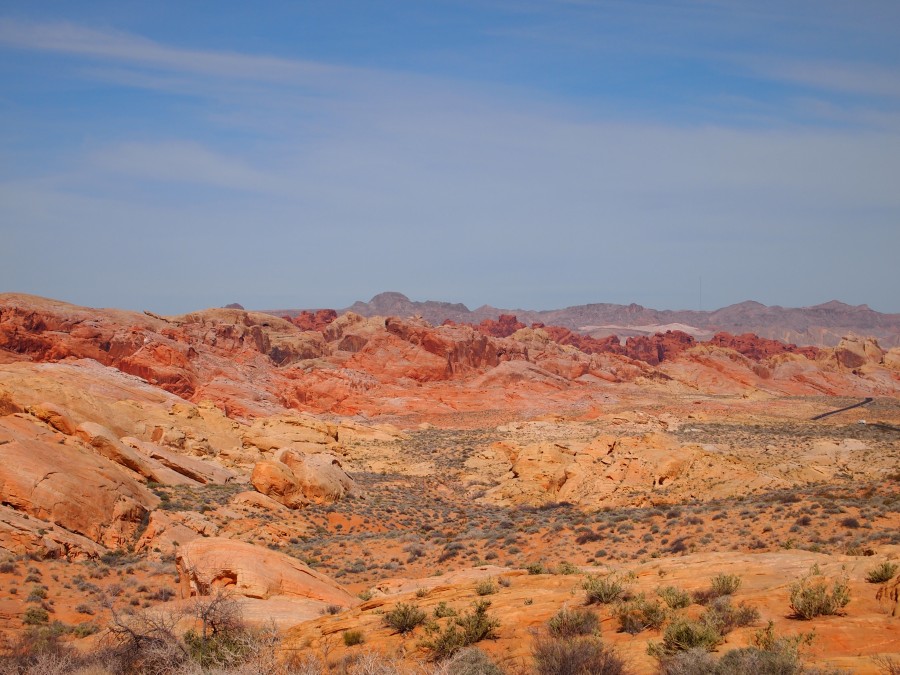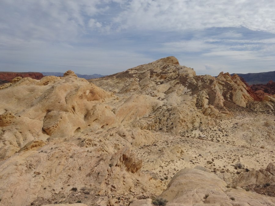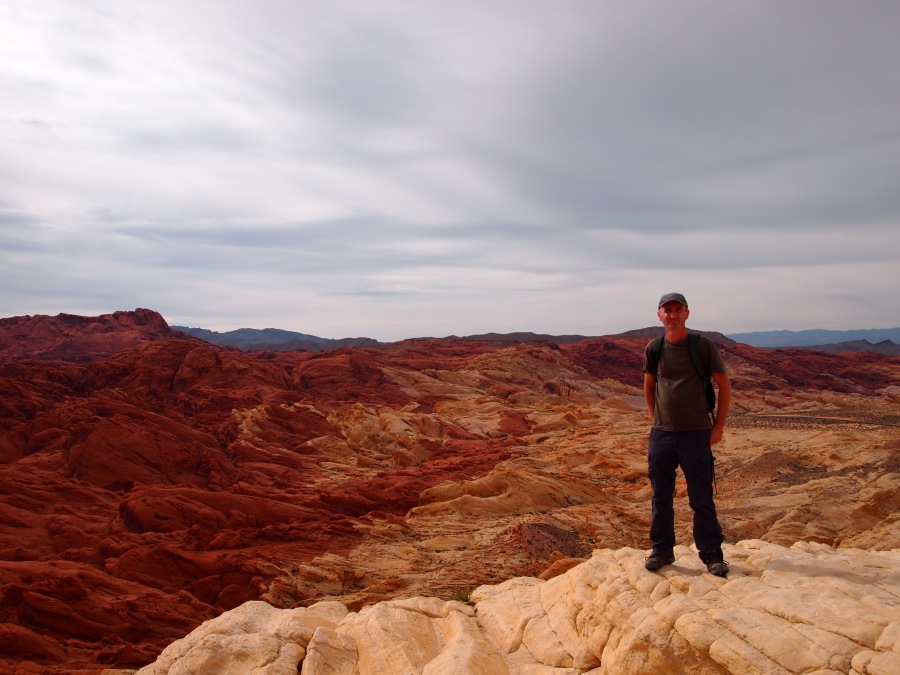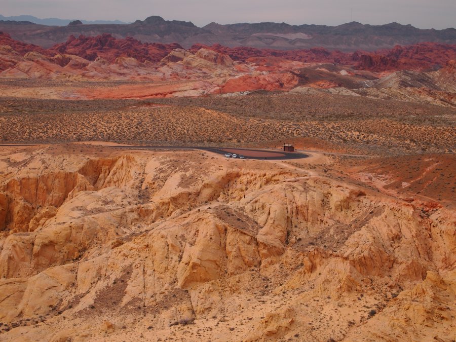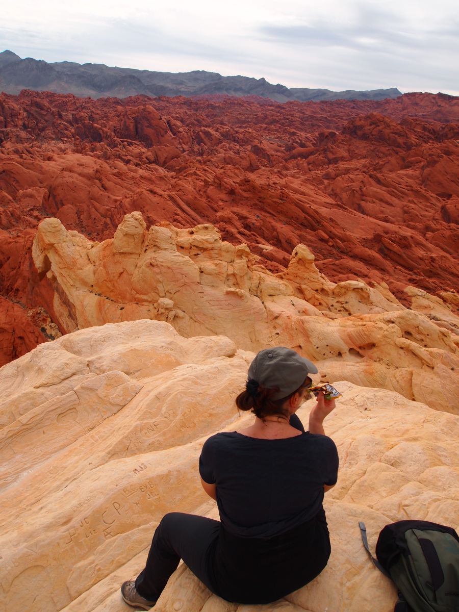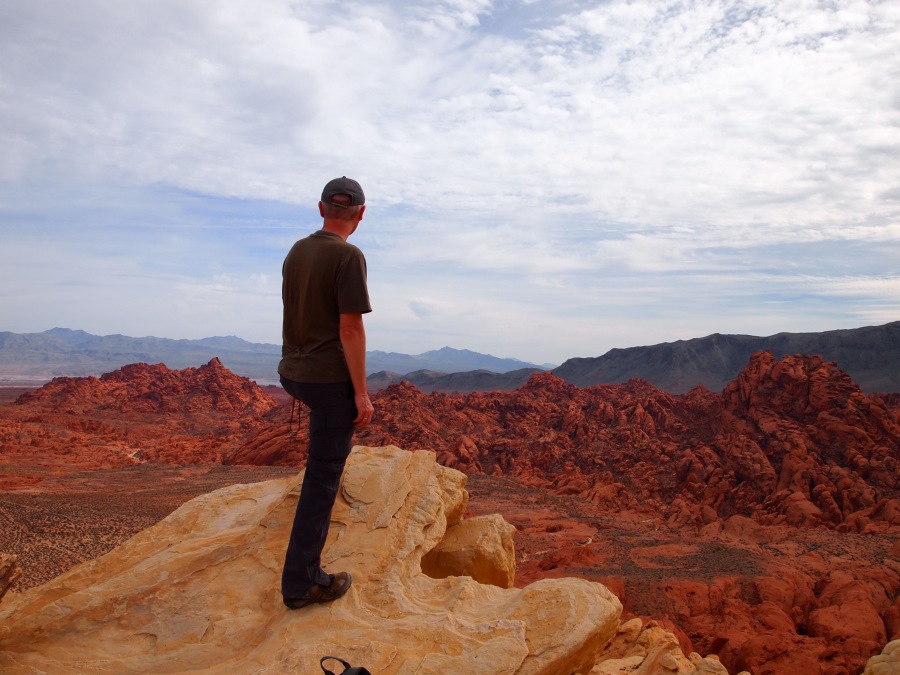Von der Spitze ist die Aussicht auf die Umgebung phänomenal. Der gesamte Bereich des Valley of Fire, hinüber bis zum Lake Mead und Little Finland Bereich. Besonders der Übergang vom gelben auf das rote Gestein hat es uns angetan.