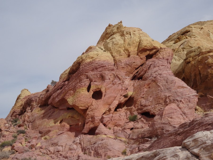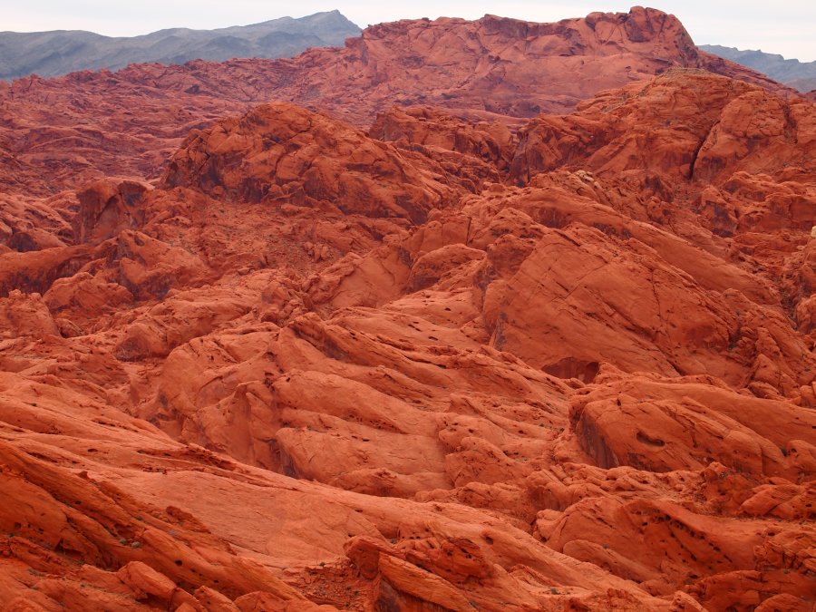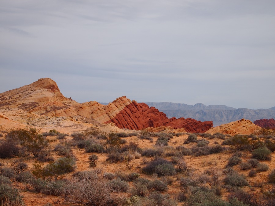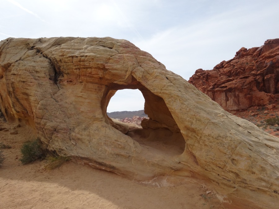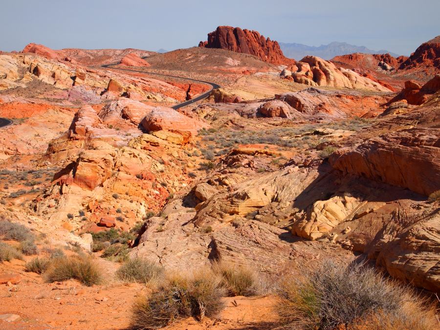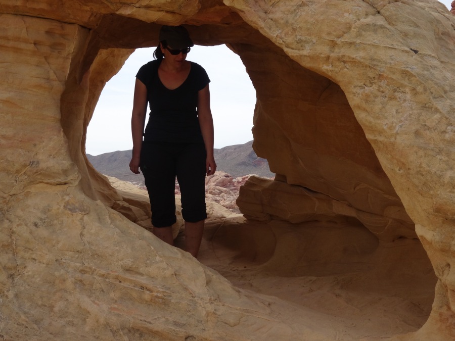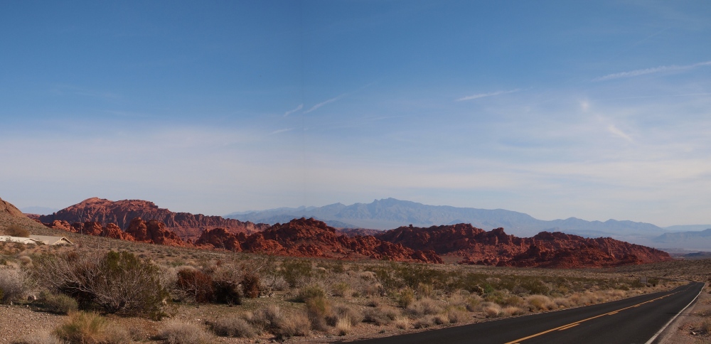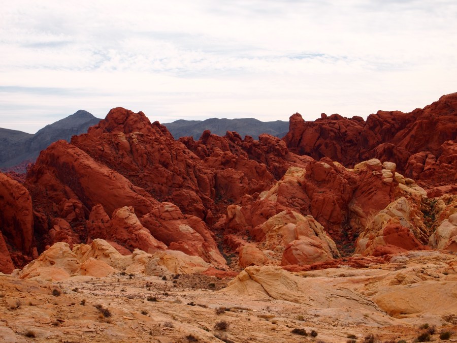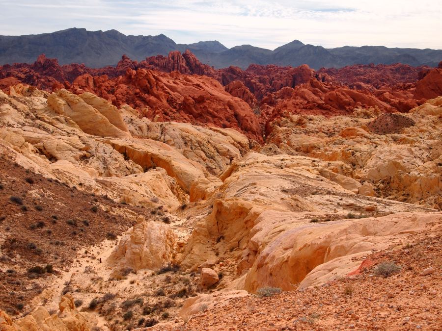 Von der Spitze ist die Aussicht auf die Umgebung phänomenal. Der gesamte Bereich des Valley of Fire, hinüber bis zum Lake Mead und Little Finland Bereich. Besonders der Übergang vom gelben auf das rote Gestein hat es uns angetan.