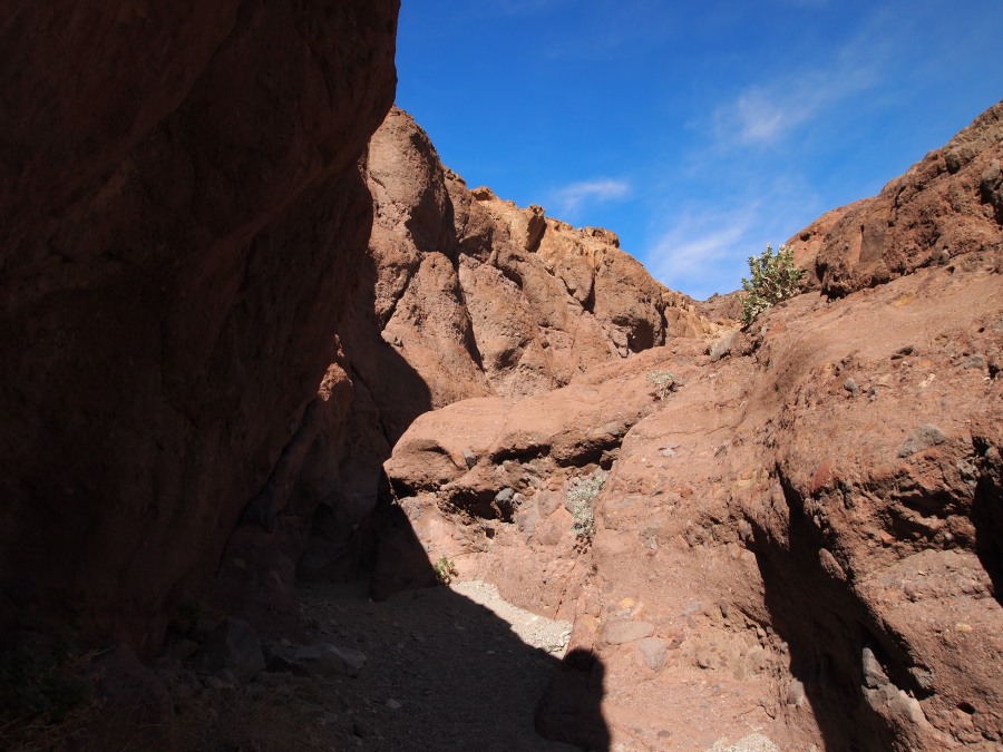 Der Canyon schneidet sich einmal enger, einmal weiter durch den dunklen roten Felsen. Meist geht es auf dem Schotterbett dahin.