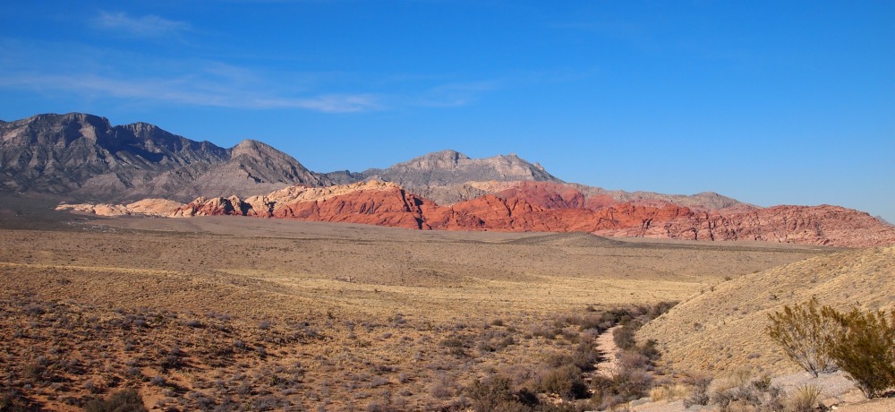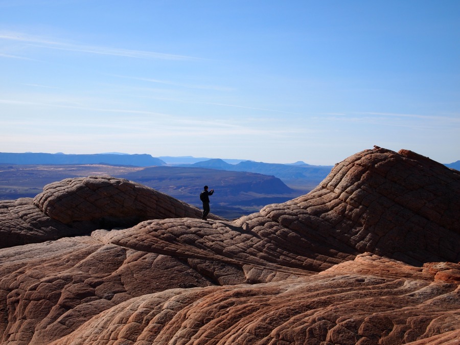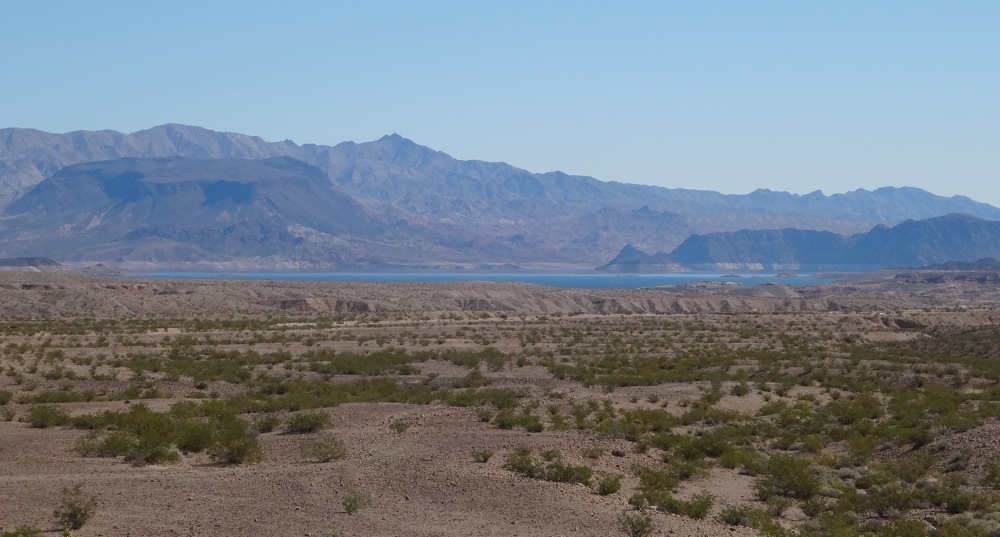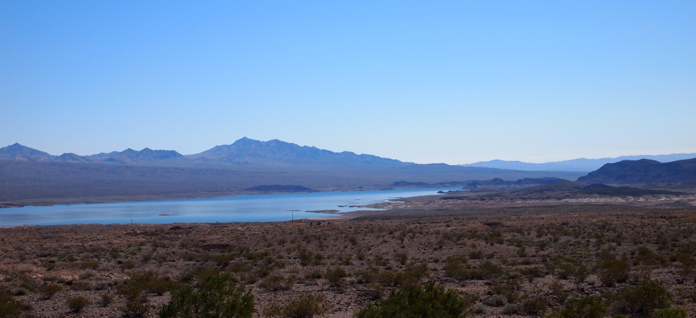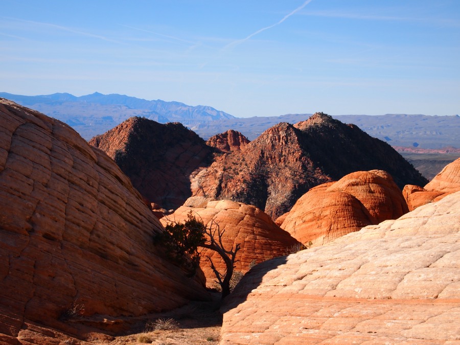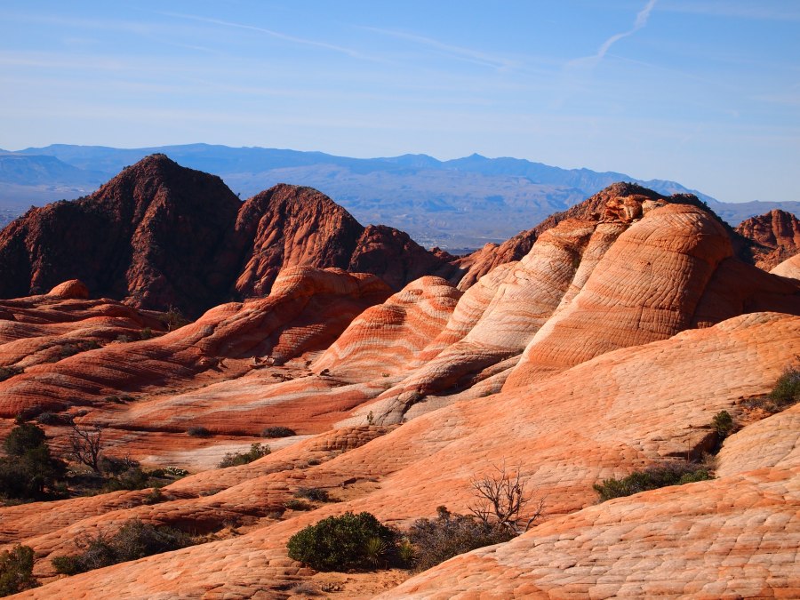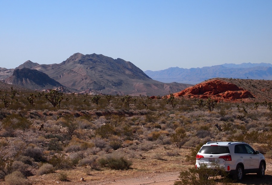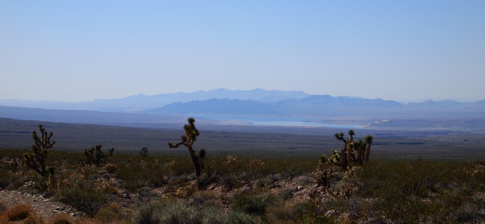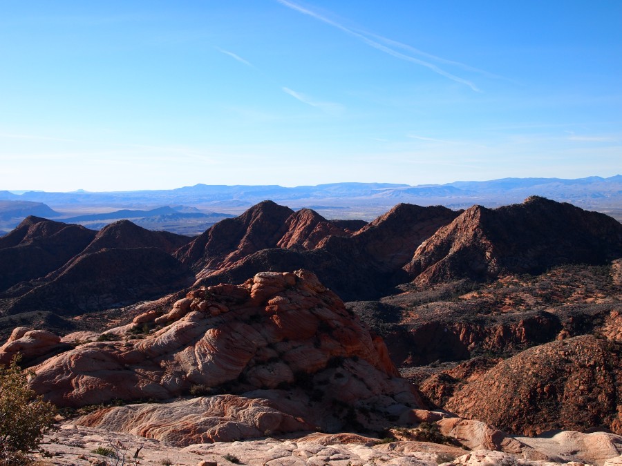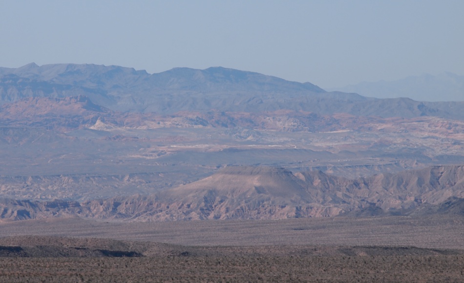 Am Beginn gibt es einen tollen Ausblick zum Valley of Fire und dem Lake Mead. Auf der linken Seite mittig der Silica Dome mit dem Übergang von gelben auf roten Felsen und rechts das Gebiet um die Fire Wave.