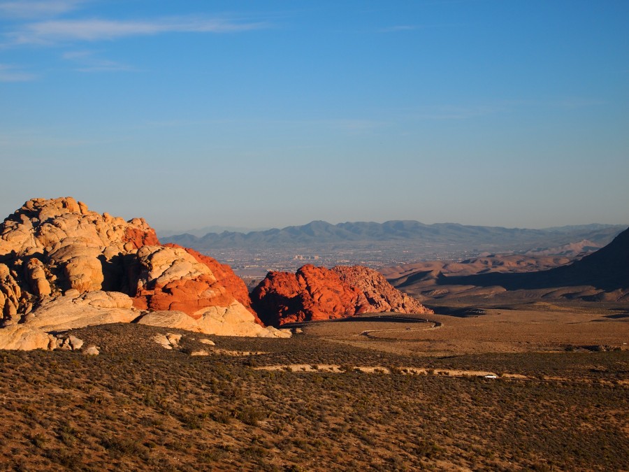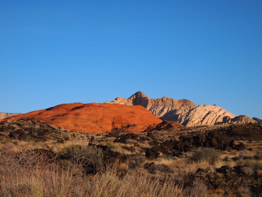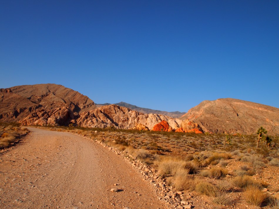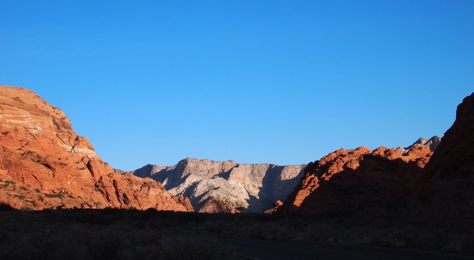 Als wir die Gravel Road wieder erreichten ging es rasch zurück zur I15. Die abendliche Sonne ließ die Whitney Pocket in einem ganz anderen Licht erscheinen.