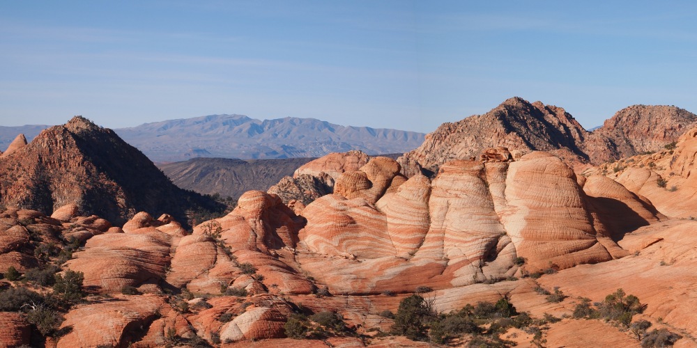 Wir fuhren weiter Richtung Kreuzung zum Devil´s Throat und trödelten auch hier herum. Wir hielten noch bei einem nahen Felsen um die Whitney Pocket in der gesamten Pracht zu fotografieren. Es entstand ein Doppelpanorama.