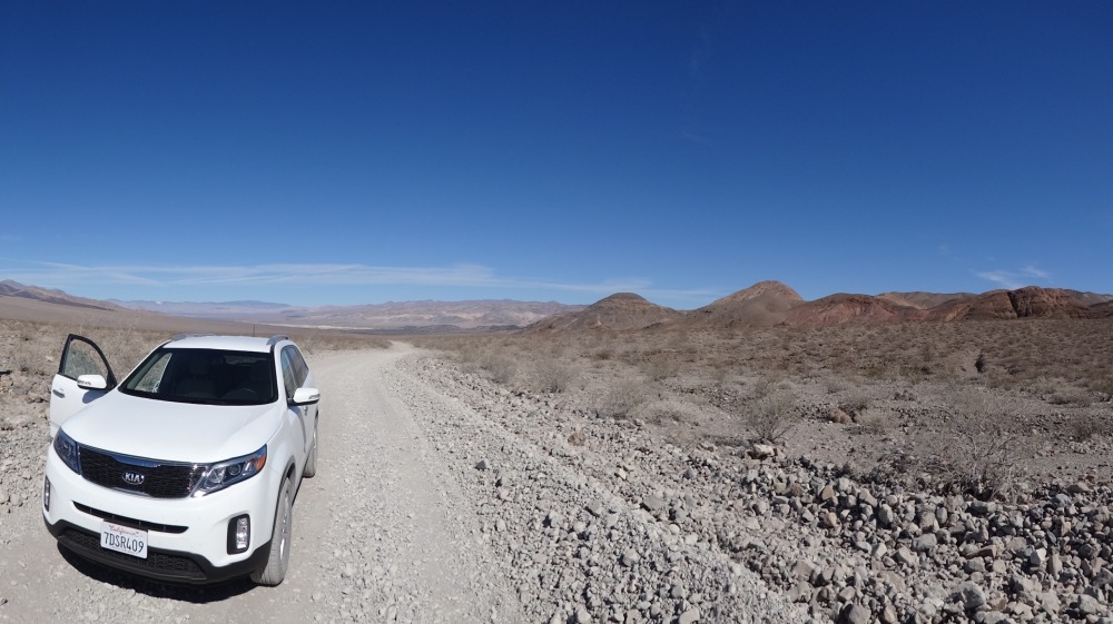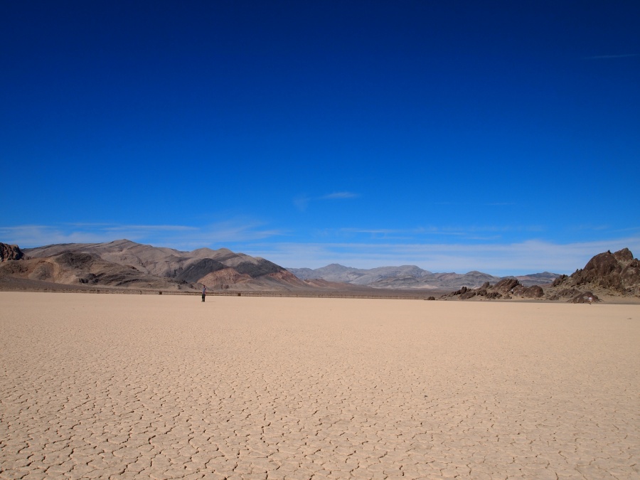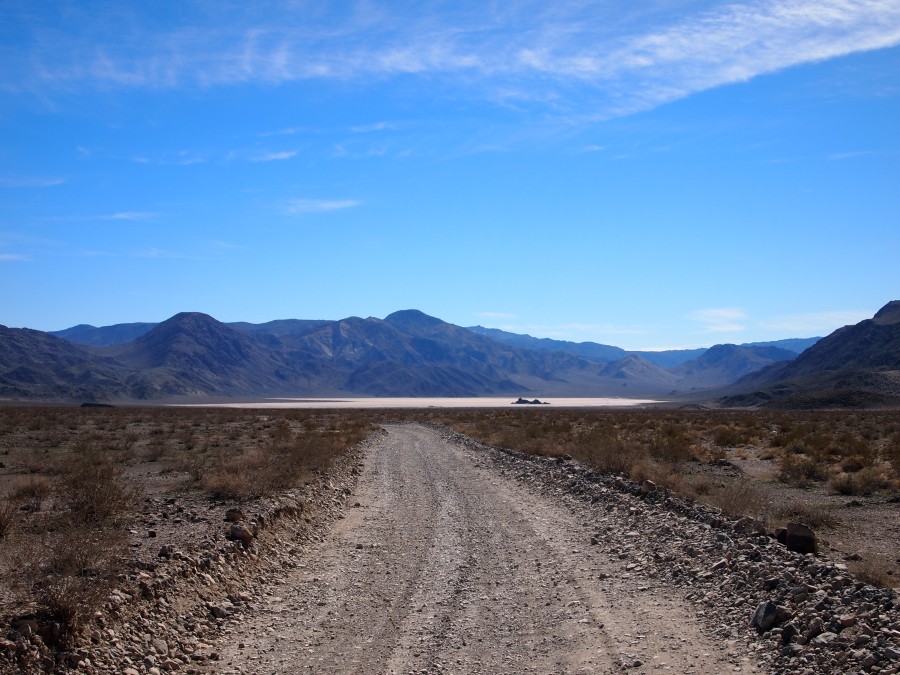 22.02.2014 Titus Canyon, Racetracks, Ubehebe Krater Teil 2Nach der Überraschung mit dem Titus Canyon, fuhren wir weiter Richtung Ubehebe Krater um auf die Gravel Road zu den Racetracks zu gelangen. Vor der Abzweigung zum Krater wurde der Verkehr wegen einer Baustelle wechselseitig angehalten. Ich stieg aus, um mir die Füße zu vertreten. Als die Aufseherin das sah, kam sie sofort zu mir und trieb mich freundlich aber bestimmt in mein Auto zurück. Ich sagte zu ihr, dass ich bei einem Straßenbetreiber arbeite und die Gefahren kenne. Sie antwortete, dass sei ihr Job und sie bekäme Probleme, wenn sie das nicht mache. Nach ca. 15 Minuten durften wir dann weiterfahren.