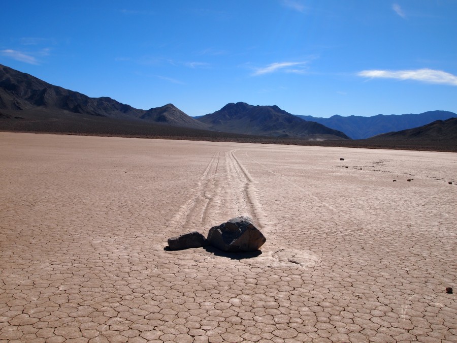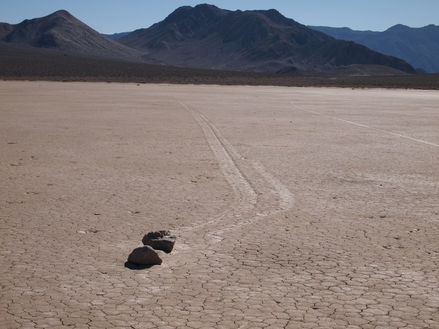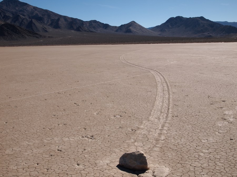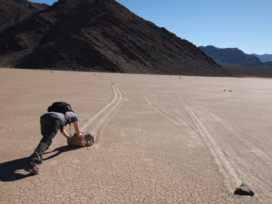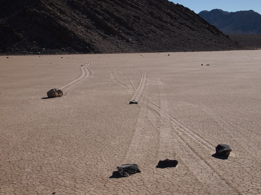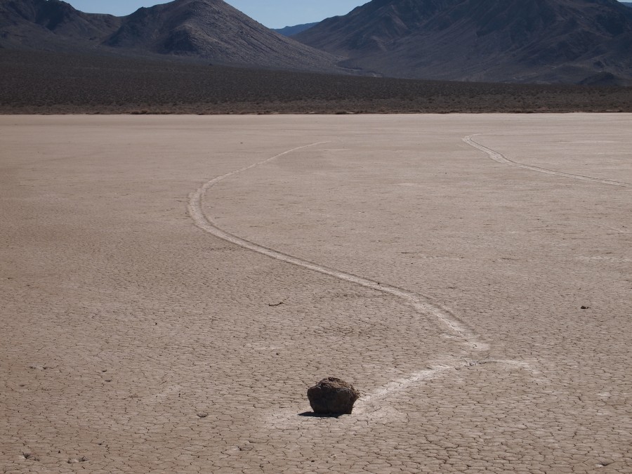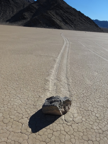 Warum sie mit ziemlicher Geschwindigkeit herumrutschen, ist noch nicht restlos geklärt. Es gibt einige Theorien. Meine Theorie ist, wenn Wasser im See steht oder der Untergrund dünnflüssig schlammig ist, und entsprechend starker Wind weht, fangen die Steine zu rutschen an. Sie kleben förmlich in kleinen Vertiefungen, wenn dann einmal der Anfangswiderstand überwunden ist, ist die Energie ausreichend, damit sie auf der Oberfläche dahingleiten. Wirst du wohl stehen bleiben!!!!