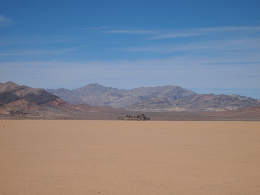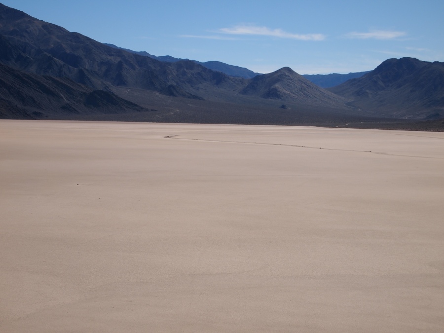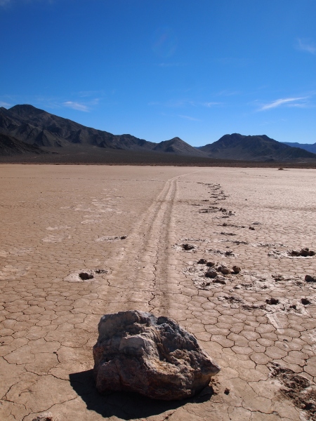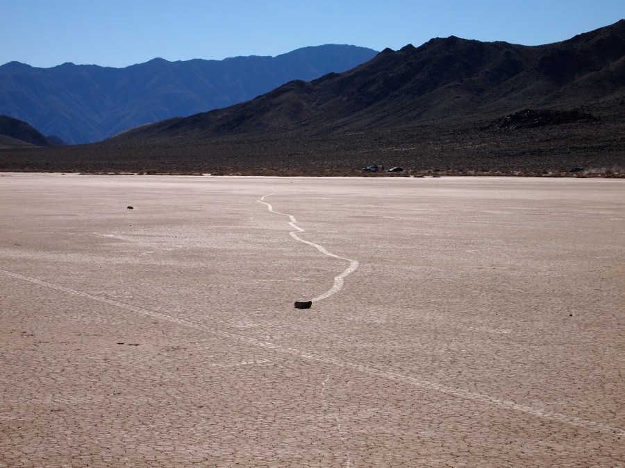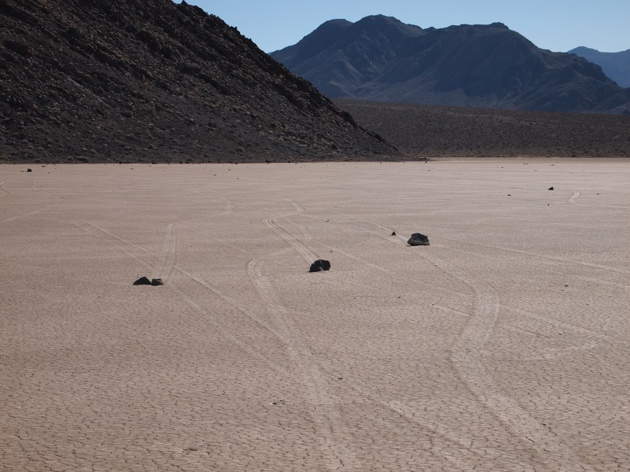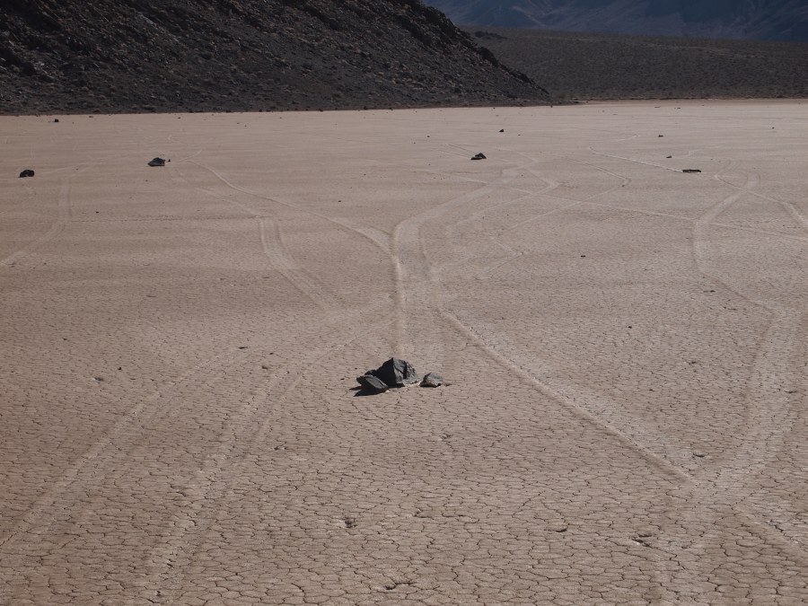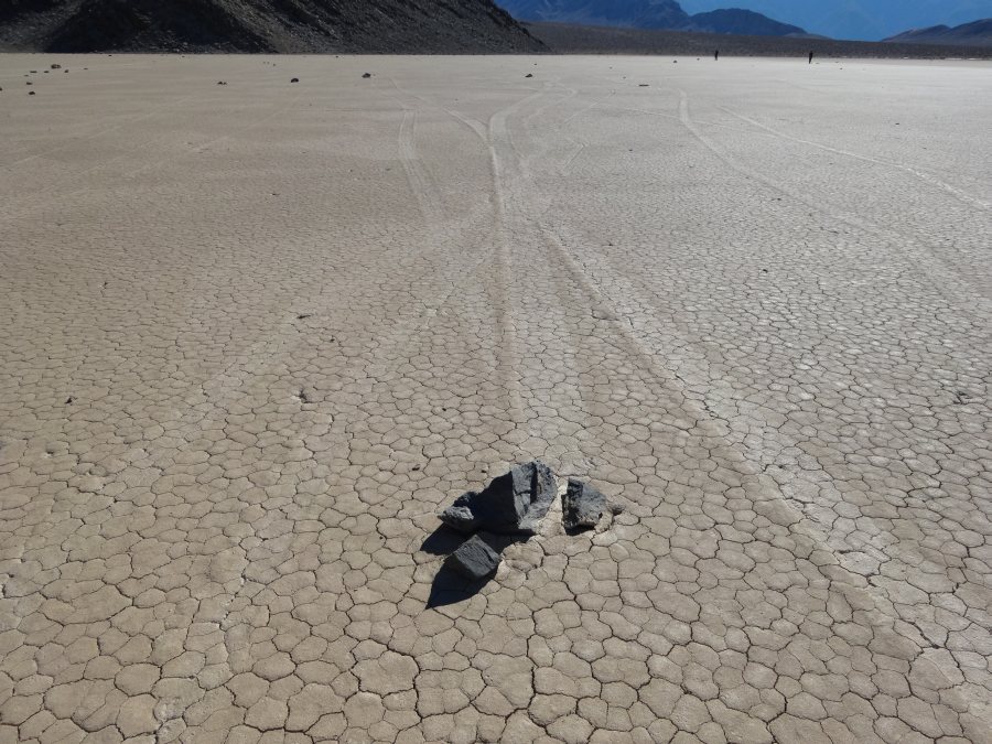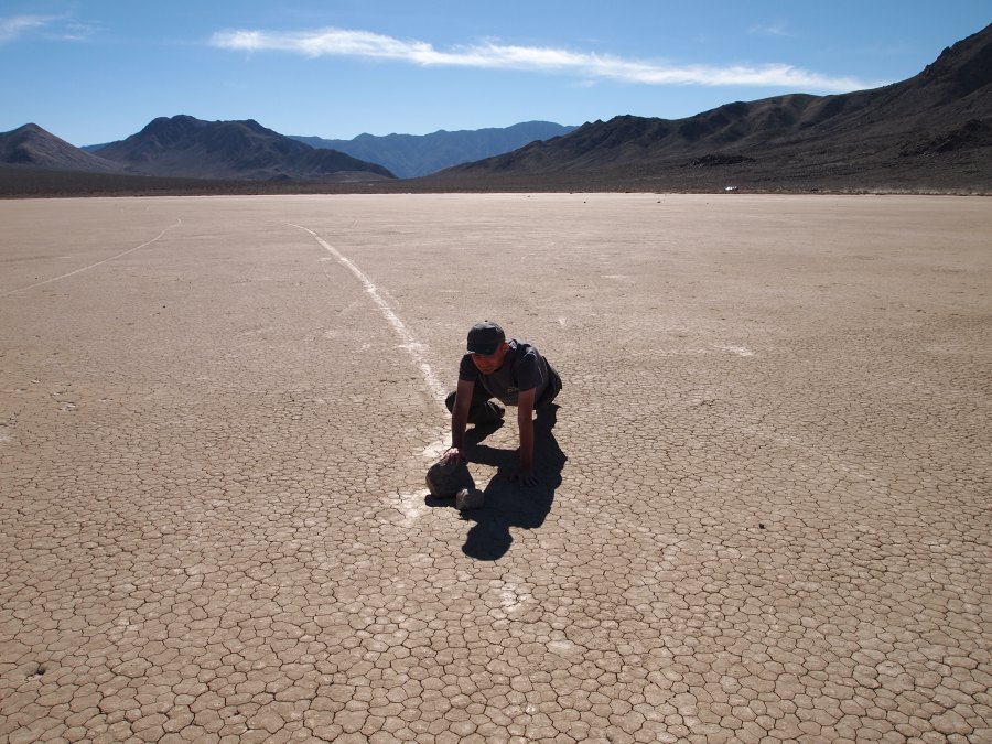Warum sie mit ziemlicher Geschwindigkeit herumrutschen, ist noch nicht restlos geklärt. Es gibt einige Theorien. Meine Theorie ist, wenn Wasser im See steht oder der Untergrund dünnflüssig schlammig ist, und entsprechend starker Wind weht, fangen die Steine zu rutschen an. Sie kleben förmlich in kleinen Vertiefungen, wenn dann einmal der Anfangswiderstand überwunden ist, ist die Energie ausreichend, damit sie auf der Oberfläche dahingleiten. Wirst du wohl stehen bleiben!!!!