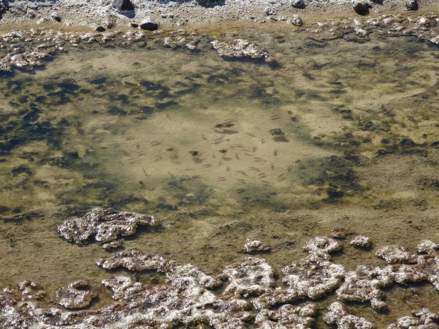 Wir bleiben beim View Point stehen und spazieren voller Hoffnung auf viele rutschende Steine auf die trockene Fläche des Sees.