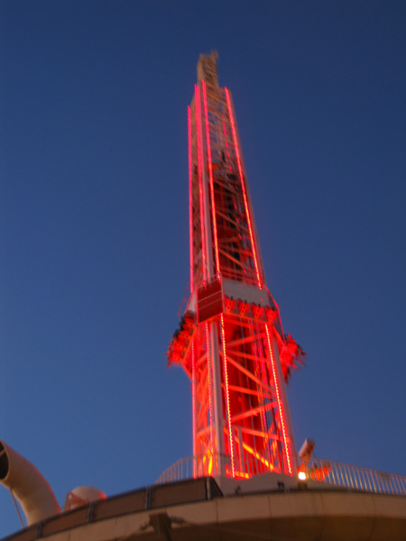 Ich steige in den Free Fall Turm. Das ist schon ein schicker Nervenkitzel. Oben auf dem Turm dann noch mal hinauf katapultiert zu werden und dann wieder abwärts fallen. Ihr kennt solche Türme sicher von hiesigen Freizeitparks oder größeren Jahrmärkten.