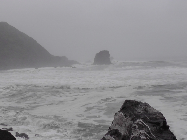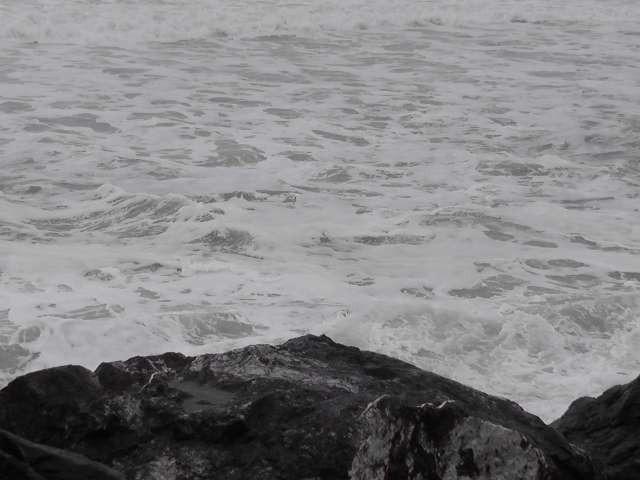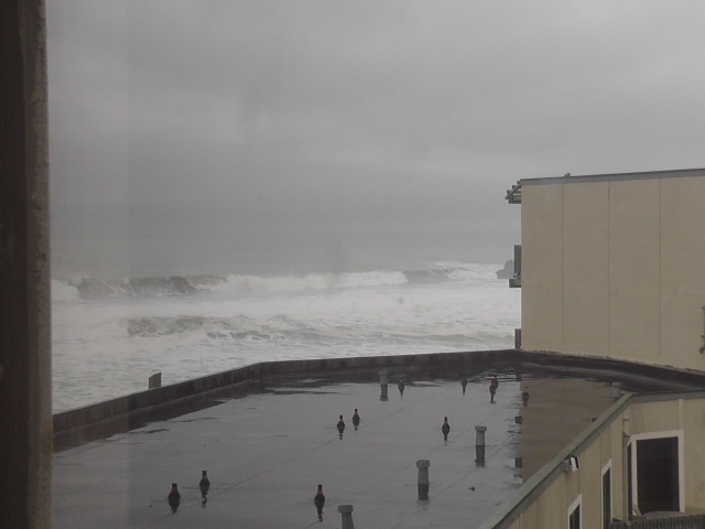 Bei stürmischem Wetter ging es wieder los. Nach dem Auschecken ging es zum Parkplatz, dort hatten wir diesen Ausblick auf die See.