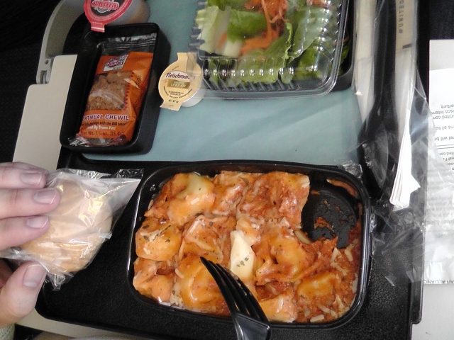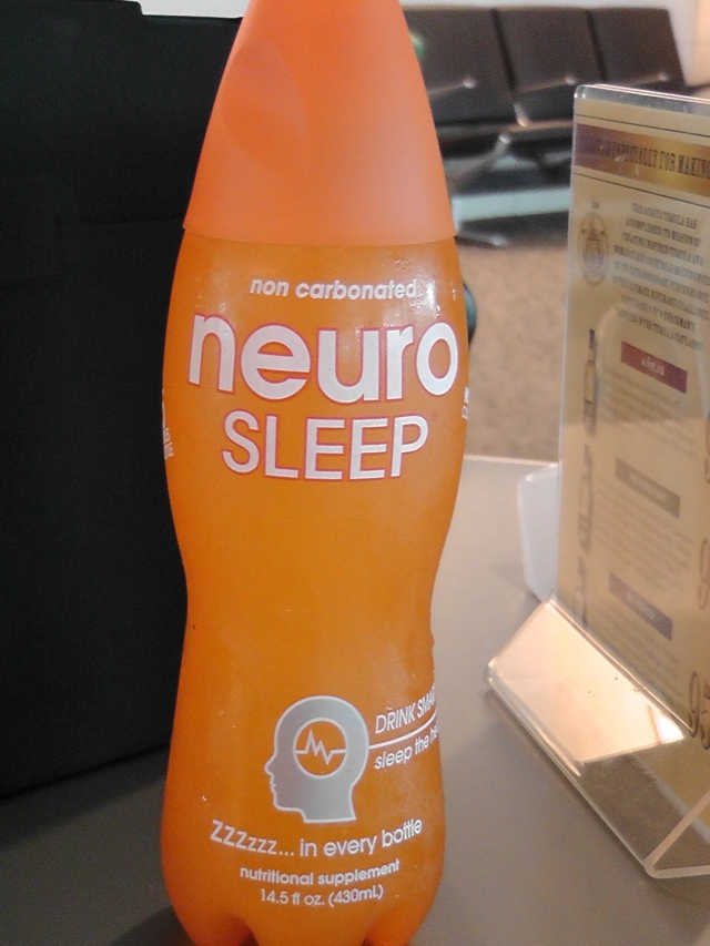 Schon spannend, die sind hier wesentlich strenger als bei uns. Schuhe aus, Körperscanner. Wir hatten noch genug Zeit und setzten uns am Gate an die Tische, schauten TV und holten uns warmes Ciabatta Brot und dieses interessante Getränk, was mir beim Schlafen im Flugzeug helfen sollte: