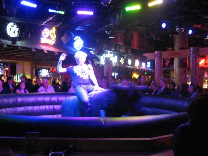 Hier gibt’s auch Bullriding und Gabi will das uuuunbedingt ausprobieren. Als sie hört, daß es nur 5$ kostet, ist sie sofort Feuer und Flamme und wenig später sitzt sie auf dem bockenden Kunst-Bullen. Anderthalb Minuten Spaß für sie und die umstehenden und wieder einen Traum erfüllt.