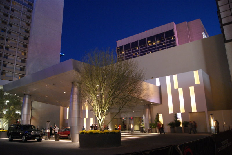 Leider ist die Bar total voll und wir müssen uns auch langsam für’s Abendessen fertigmachen. Noch den neugestalteten Eingang vom Quad (ehemals Imperial Palace) fotografiert..