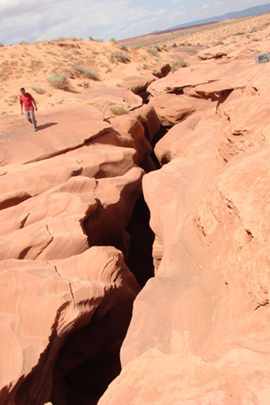Draußen erzählte der Indianer, das gestern angeblich eine Flut von der Mesa vor dem Kraftwerk gekommen sei. Als sie entdeckt wurde hat sie nur noch 3 bis 5 Minuten gebraucht bis sie beim Eingang war. Sie haben die Leute nach unten hinausgetrieben. Daher sind sie heute auch so vorsichtig und lassen nur wenige Leute in den halb geöffneten Canyon. Vor dem Eingang begutachteten wir noch die schmale Spalte in der wir geraden noch geklettert sind.
