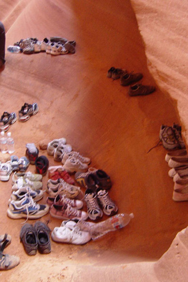 Der Indianer blieb immer hinter uns damit keiner zurück in den Canyon konnte. Die Schuhe nahmen wir in die Hand und gingen Paarfuß zum Ausgang. Wieder mit beeindruckenden Farbspiel.