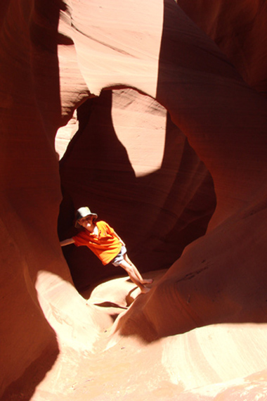 Wir reparierten mit Dietmars Klappmesser, so gut es ging, die am Gouldings CG beschädigte Leiste an meinem WoMo. Nach getaner Arbeit war nicht mehr viel zu erkennen bzw. ging in der Vielzahl der anderen alten Beschädigungen unter. Heike war schon ganz lästig, wie ein Kind vor Weihnachten, weil sie es schon nicht mehr erwarten konnte zum Antelope Canyon zu fahren. Am mittleren Vormittag gings dann los, zum Wal Mart vor erst. Nach ein paar Einkäufen fuhren wir zum Lower Antelope Canyon. Den Upper kannten wir ja schon. Beim Kassenhäuschen saß eine junge hübsche Indianerin die uns gleich erklärte, dass der Canyon auf Grund der gestrigen „Unwetter“ nur zur Hälfte geöffnet ist. Der Eingang ist zugleich auch der Ausgang. Kosten tut es trotzdem gleich viel, 26 $ pro Person. Die Kinder sind frei. Wir wollten trotzdem hinein, diese Entscheidung sollte sich noch als goldrichtig erweisen. Um 11 durfte die nächste Gruppe hinein. Schon der Einstieg in diese schmale Spalte ist genial.