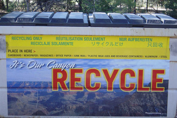 Wir sind mit Sonnenaufgang Richtung Williams losgefahren. Bevor wir den CG verließen fiel mir noch ein Abfallsammelcontainer für Verpackungen auf. Der hatte einen interessanten Aufkleber. Soviel zum Thema, dass nicht alles wörtlich genommen werden muss.