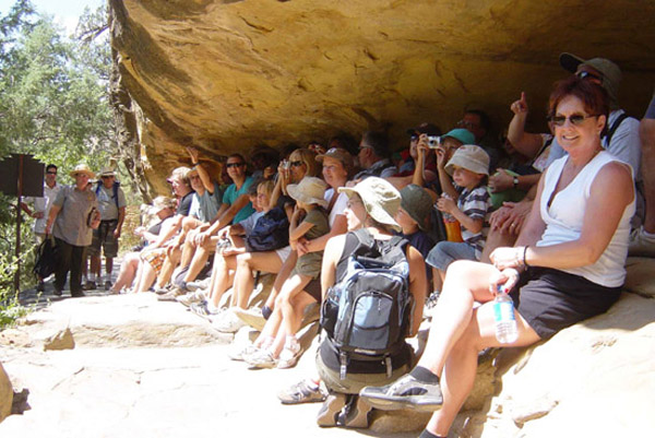 Hier wollten wir alle an der Führung teilnehmen. Eine gestrenge Rangerin führte die Tour. Wieder die üblichen Belehrungen. Kaum waren wir unten, hat Jonas aus seiner Trinkflasche getrunken. In der war aber etwas Multivitaminsaft. Sie stänkerte uns sofort an, die Flasche wegzustecken, da dass kein Wasser sei!?! Ich nehme mal an, ein Vierjähriger trinkt lieber Saft als Wasser, zumindest unserer. Die Gruppe, Sonnengeschützt. Im Hintergrund die gestrenge Rangerin (selber wohl keine Wassertrinkerin).