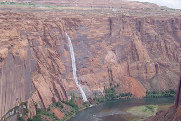 Wir fuhren weiter in den Ort Page um etwas zu essen. Es hat sich nun so richtig eingeregnet. Nach dem Essen fuhren wir zum Glen Canyon Dam und machten am großen Parkplatz ein Mittagspäuschen samt Nickerchen und schauten, was passieren wird. Meiner Meinung nach sollte es nicht lange regnen, da so eine Kaltfront meist schnell durchzieht. So gegen 14 Uhr hörte es auch schon wieder zu regnen auf. Wir besichtigten kurz das Visitor Center des Damms. Zuerst aber die Brücke, da eine lange Schlange (3 Busse voller Japaner) auf den Sicherheitscheck wartete. Von der Brücke aus war ein Wasserfall vom Straßenabfluss von Page zu sehen.