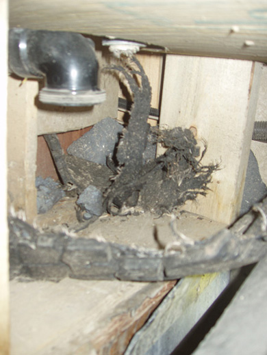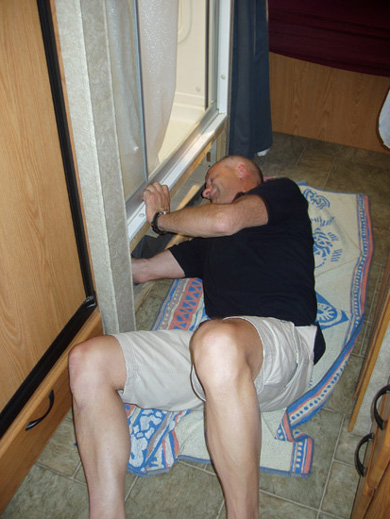 Zurück am CG bereiteten Margit und Heike noch ein Mittagessen. Dietmar beschloss, mit seinem Klappmesser die Dusche zu reparieren. Die drei Schrauben der Holzverkleidung waren schnell abgeschraubt. Nun war die Ursache allen Übels zu sehen. Ein Reifenstück war eingedrungen und hat das Abflussrohr herunter geschlagen.