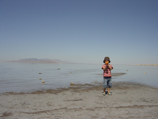 Florian, Jonas und ich gingen zurück. Jonas wollte natürlich bald getragen werden, was bei dem sandigen Anstieg gar nicht so leicht was. Das musste gleich darauf auch eine Frau, die auch für amerikanische Verhältnisse im supersize Format war, feststellen. Nach der Hälfte der Steigung konnte sie nicht mehr weiter. Sie musste sich mit hochrotem Kopf setzten. Ihr Mann lief hinauf und holte Wasser, welches er ihr über den Kopf rinnen ließ. Für die letzten 50 m brauchte sie 15 Minuten. Überglücklich erreichte sie die Duschanlagen, wo sie sich wieder erholen konnte. Auch Magdalena hatte ihre Probleme, sie erwischte einen Schluck von der 15%-igen Salzlösung im See. Zum Glück hatten wir ausreichend Wasser mitgenommen. So konnte sie Margit dann doch noch beruhigen. Beim WOMO gab es nochmals Wasser.