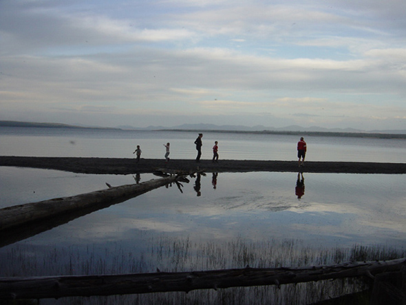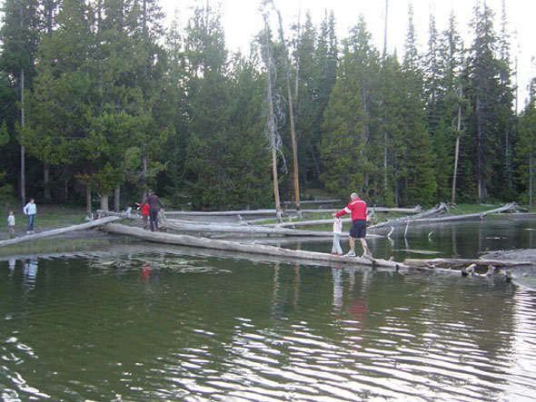Gegen Abend gingen wir noch zum Yellowstone Lake der direkt am CG lag. Wir spazierten den Strand entlang und die Kinder eroberten eine kleine Schotterinsel, die nur durch balancieren über einen Baumstamm zu erreichen war.